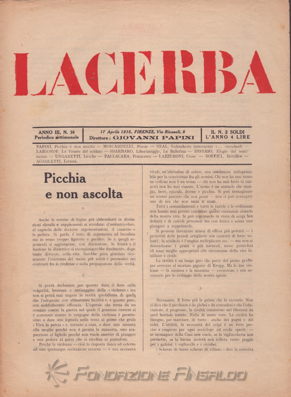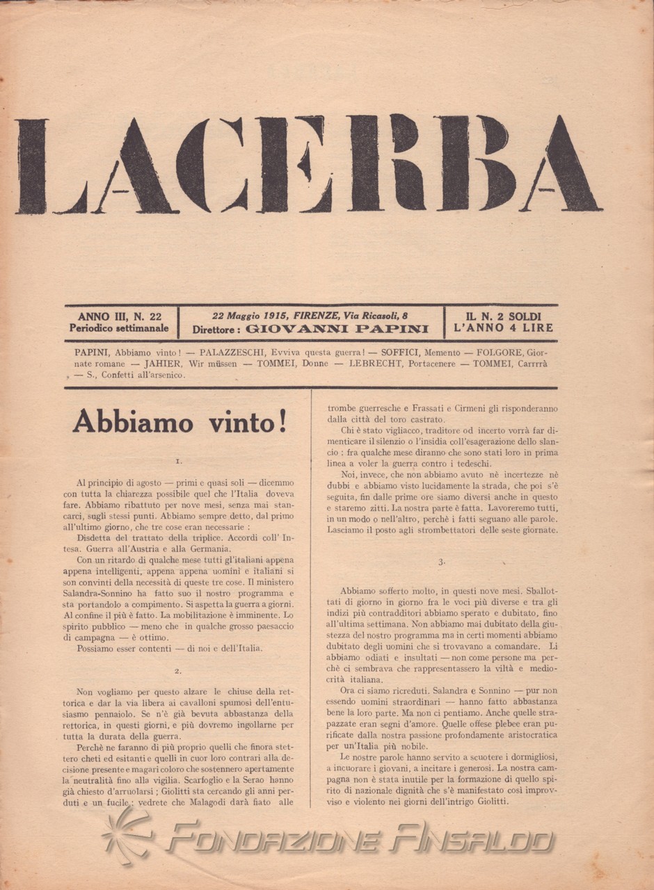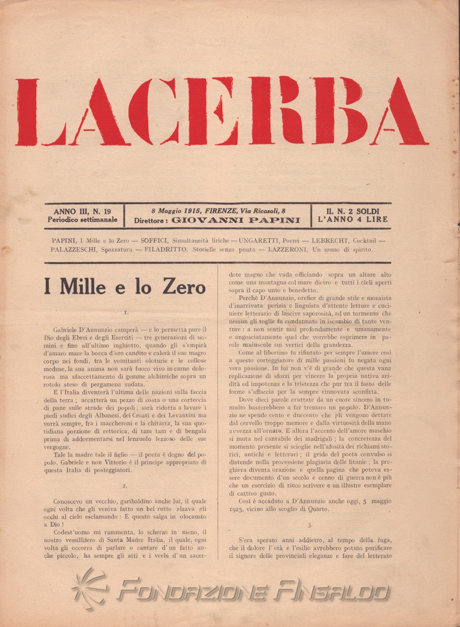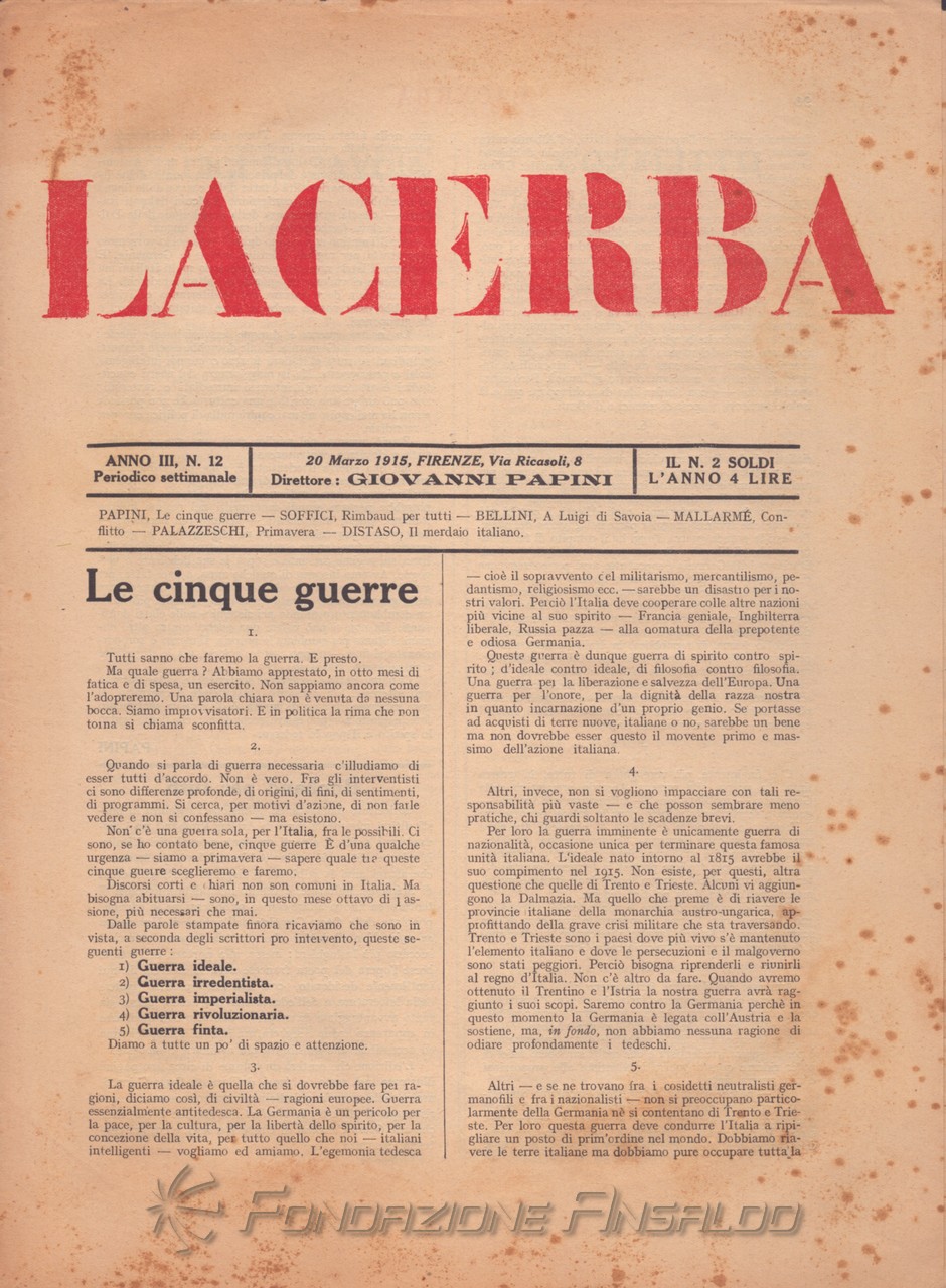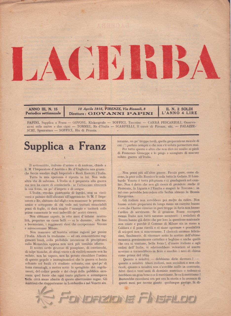 Dal 1915 il periodico esce con cadenza settimanale, Giovanni Papini assume la direzione unica della rivista, prima condivisa con Soffici, che peraltro continua a collaborare. Con il ritorno di Aldo Palazzeschi, a cui è affidata la rubrica fissa “Spazzatura”, la letteratura e l’arte rientrano sulle pagine di «Lacerba», accanto agli articoli politici.