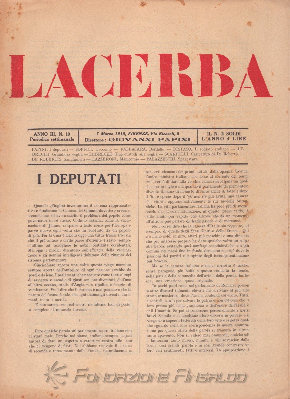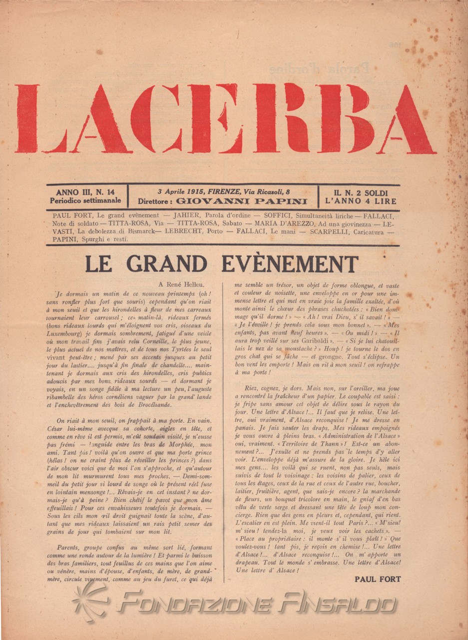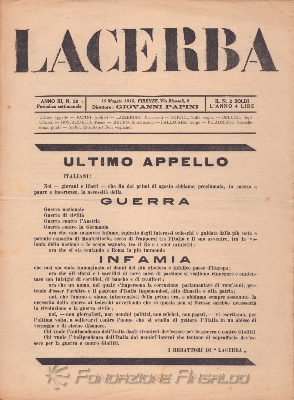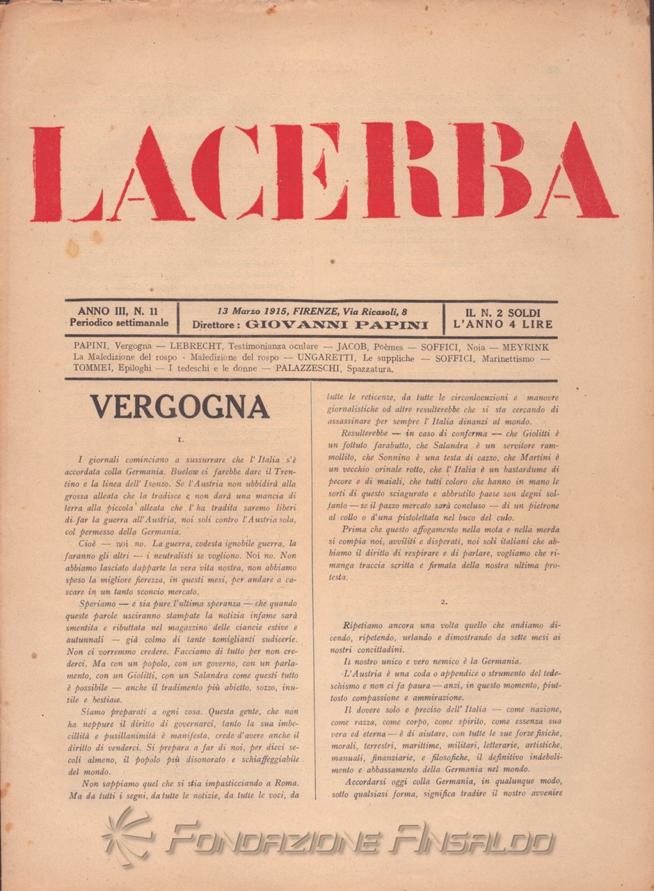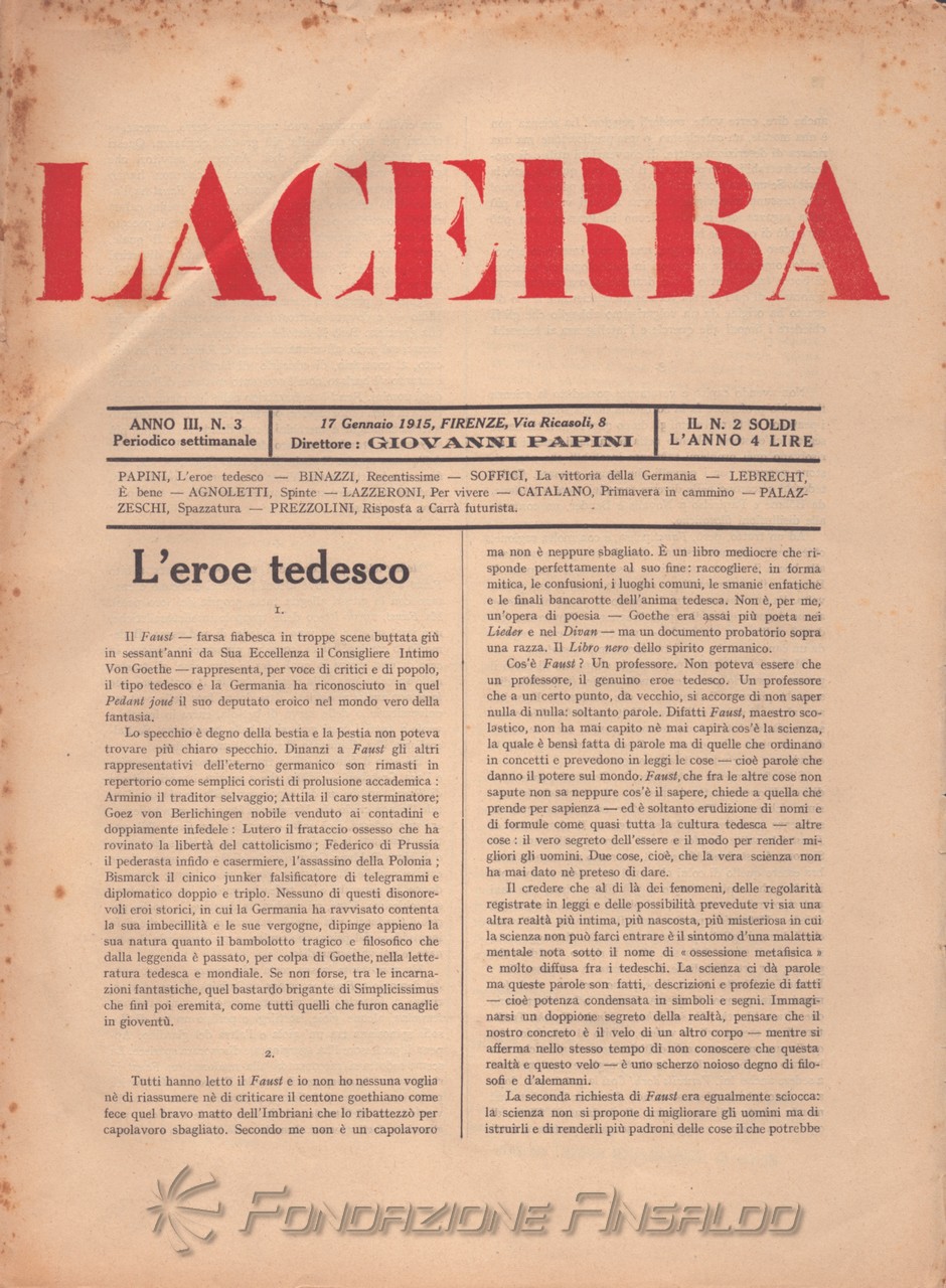 Dal 1915 il periodico esce con cadenza settimanale, Giovanni Papini assume la direzione unica della rivista, prima condivisa con Soffici, che peraltro continua a collaborare. Con il ritorno di Aldo Palazzeschi, a cui è affidata la rubrica fissa “Spazzatura”, la letteratura e l’arte rientrano sulle pagine di «Lacerba», accanto agli articoli politici.