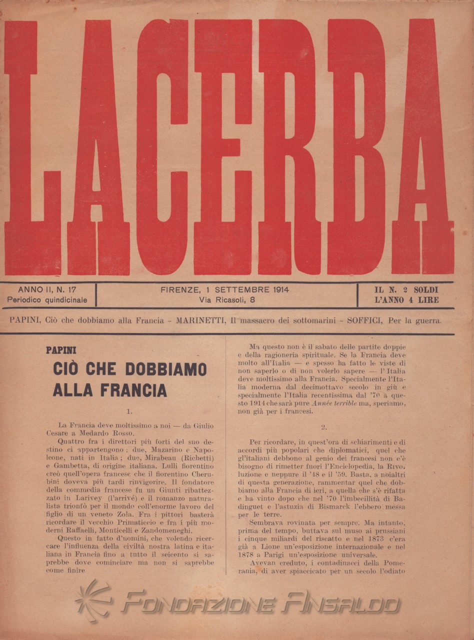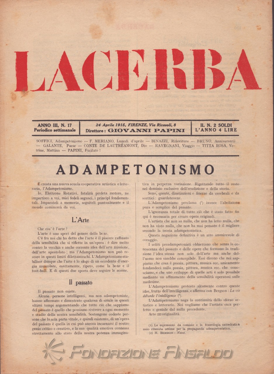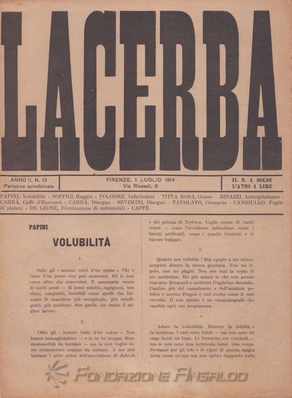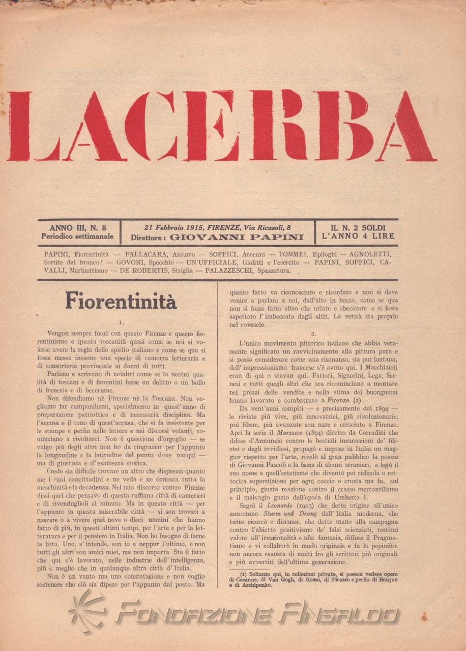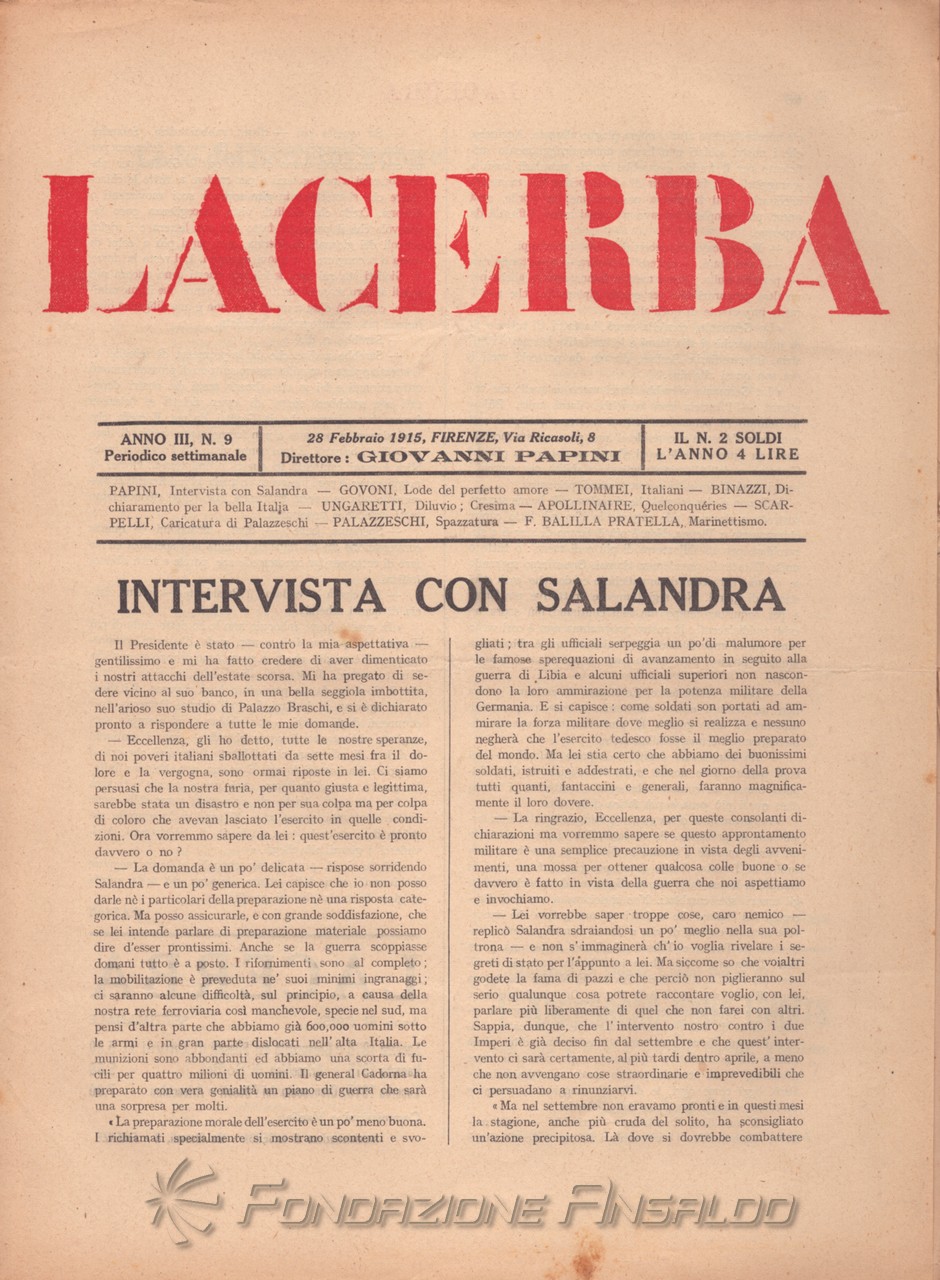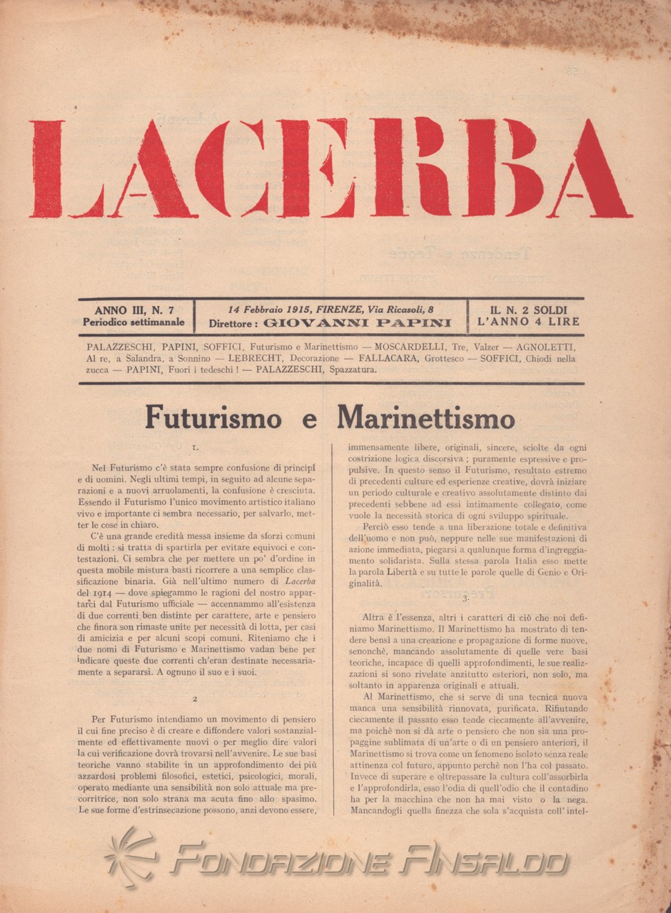 Dal 1915 il periodico esce con cadenza settimanale, Giovanni Papini assume la direzione unica della rivista, prima condivisa con Soffici, che peraltro continua a collaborare. Con il ritorno di Aldo Palazzeschi, a cui è affidata la rubrica fissa “Spazzatura”, la letteratura e l’arte rientrano sulle pagine di «Lacerba», accanto agli articoli politici.