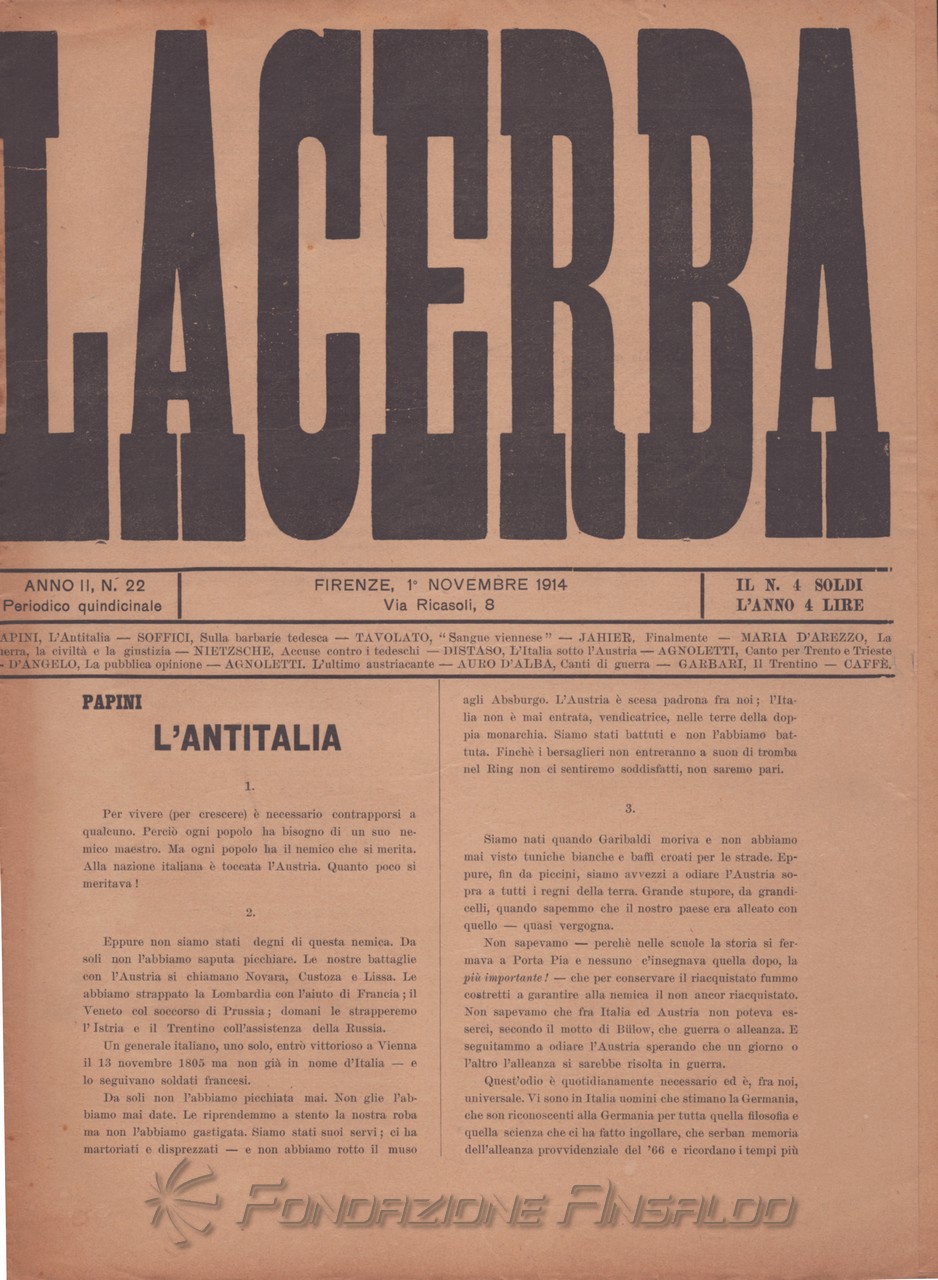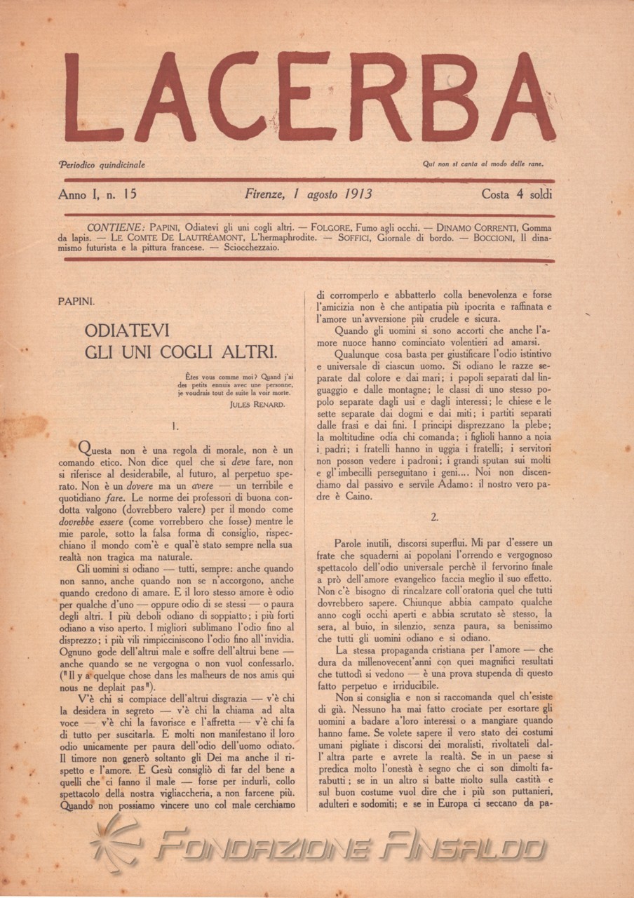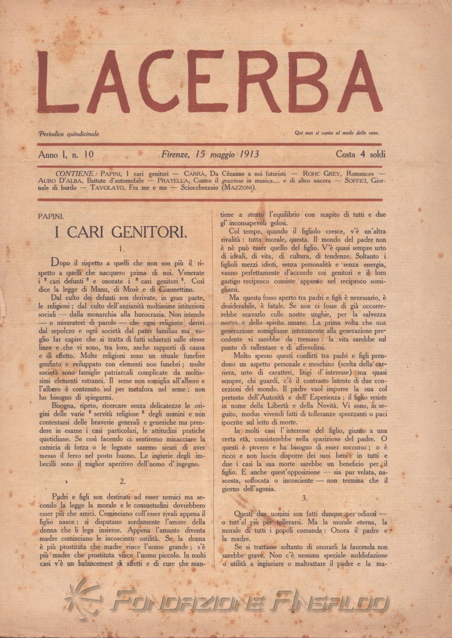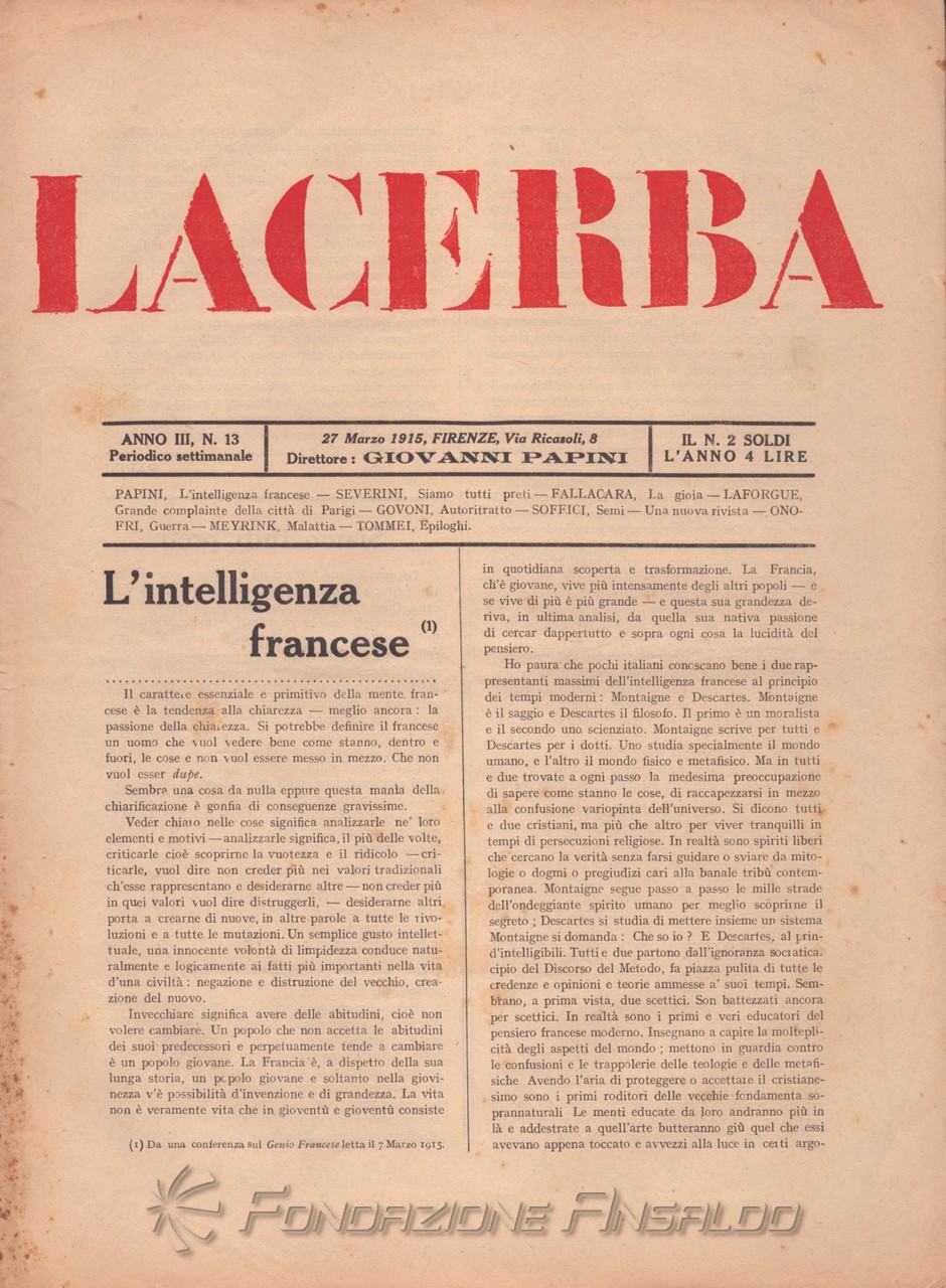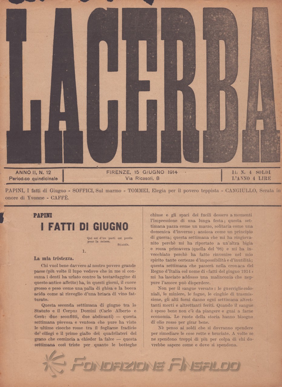 Dal 1915 il periodico esce con cadenza settimanale, Giovanni Papini assume la direzione unica della rivista, prima condivisa con Soffici, che peraltro continua a collaborare. Con il ritorno di Aldo Palazzeschi, a cui è affidata la rubrica fissa “Spazzatura”, la letteratura e l’arte rientrano sulle pagine di «Lacerba», accanto agli articoli politici.