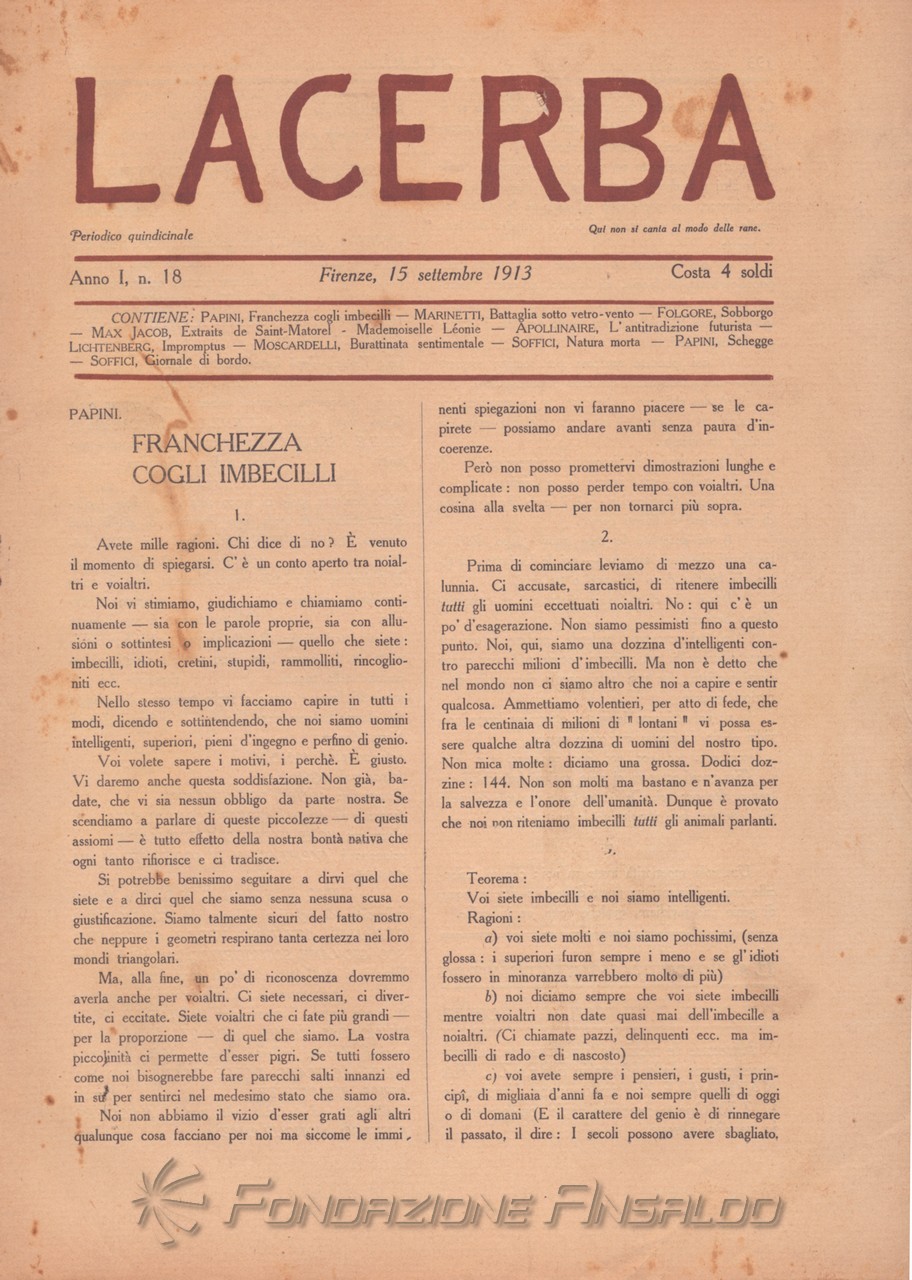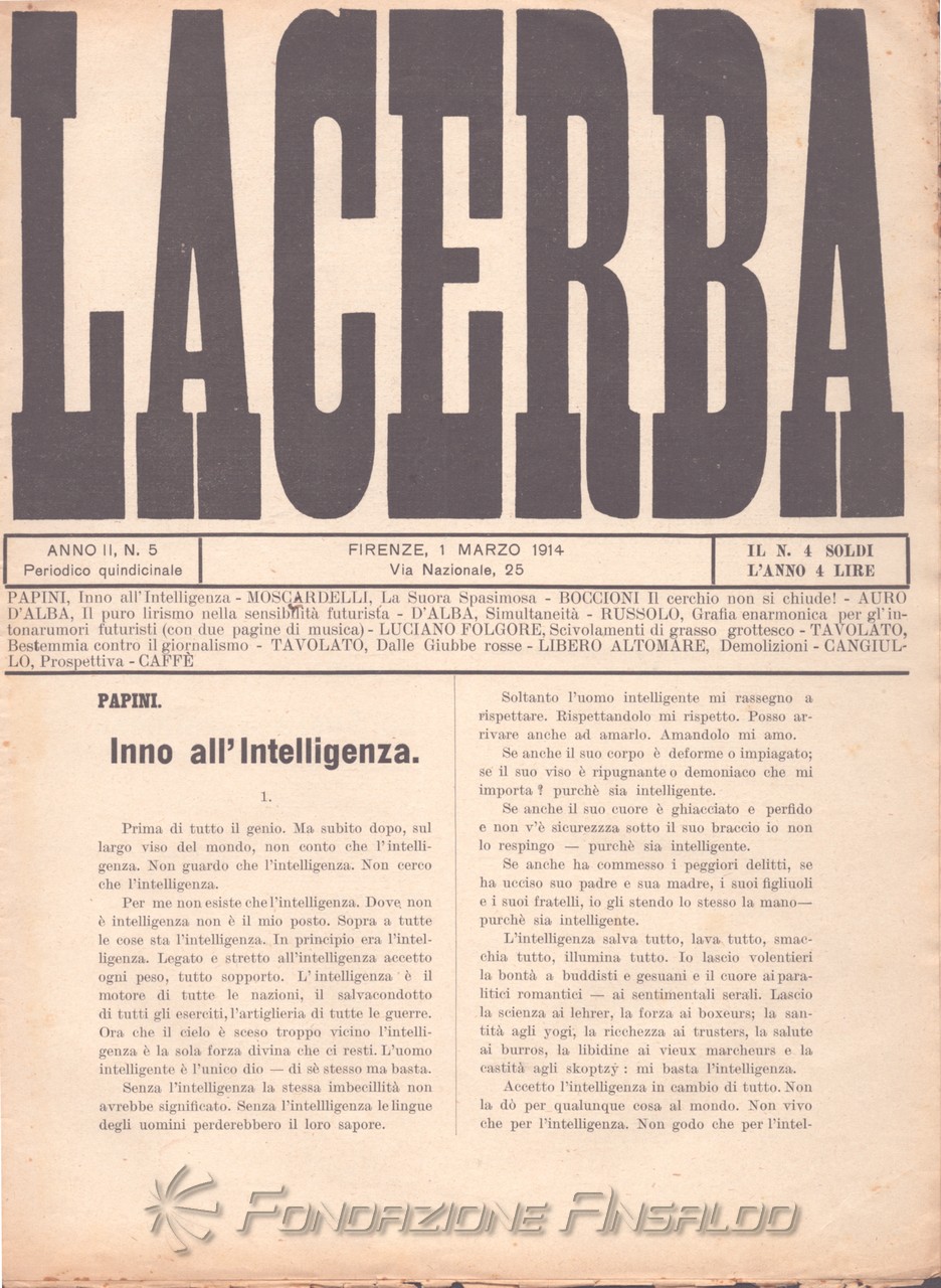 Lacerba è stata una rivista quindicinale letteraria italiana fondata a Firenze il 1 gennaio 1913 da Giovanni Papini e Ardengo Soffici, pubblicata dal gerente responsabile Guido Pogni fino alla fine del 1914 e successivamente da Pietro Gramigni, stampata dalla Tipografia di Attilio Vallecchi e C.