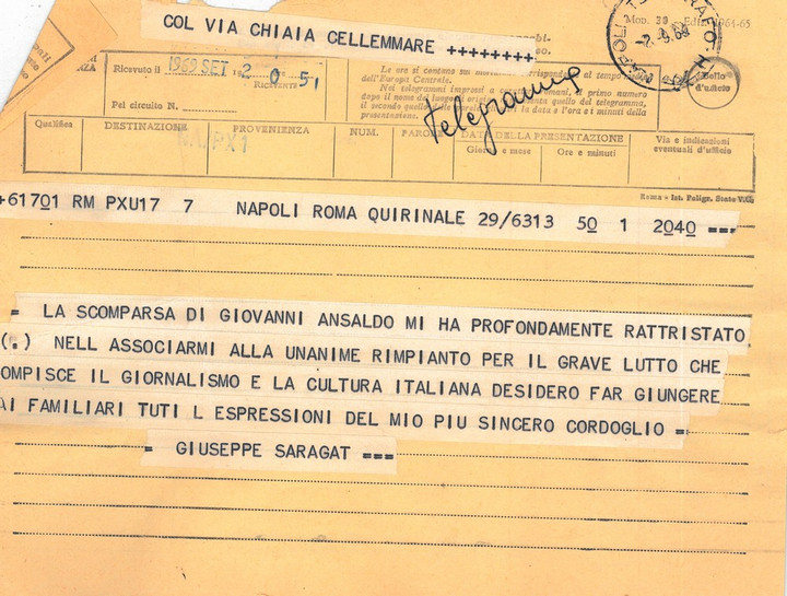 Telegrammi di condoglianze per la morte di Giovanni Ansaldo