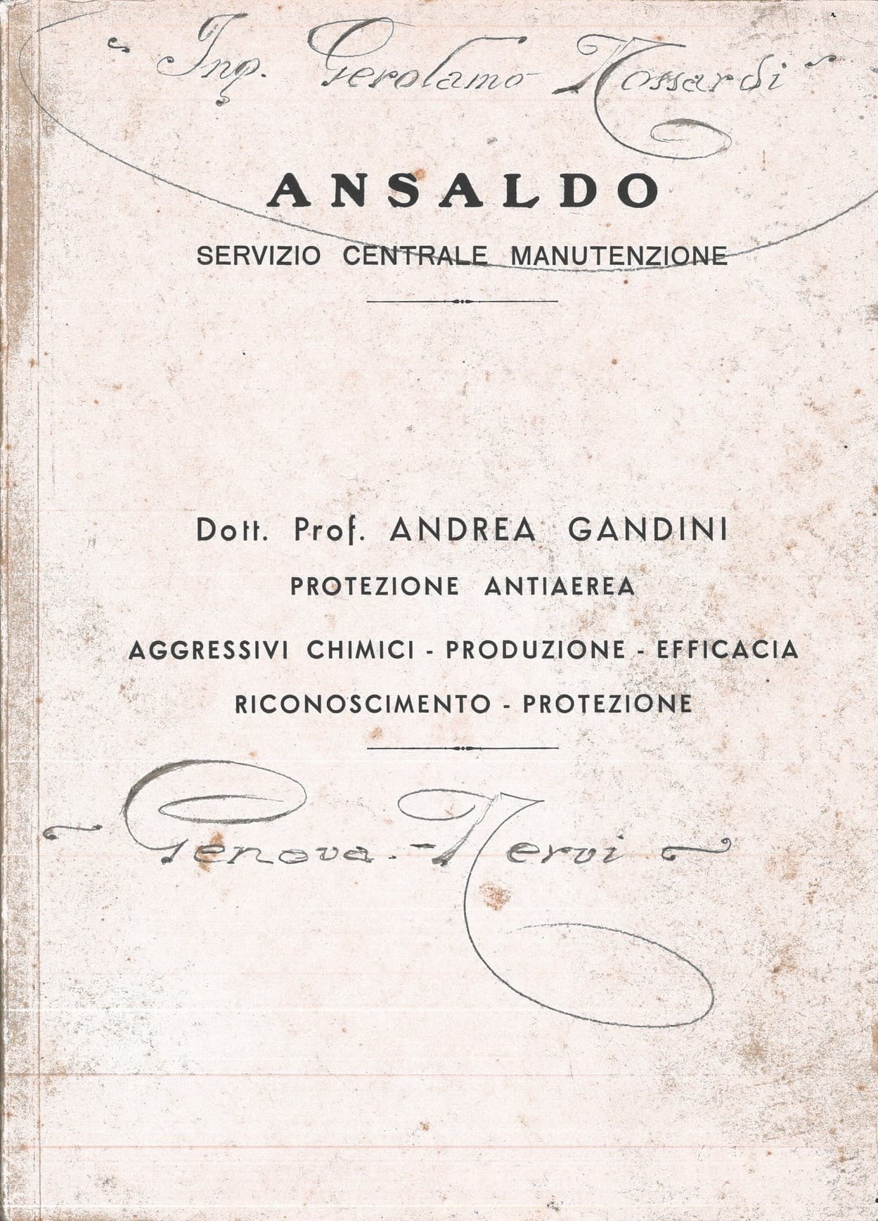 Tra queste pubblicazioni particolarmente interessante risulta essere il volume edito nel 1938 dalla società Ansaldo e relativo ad un corso per i propri dipendenti sugli attacchi chimici e sulle possibili contromisure. Il corso, tenuto dal Prof. Andrea Gandini dell'Istituto di Chimica farmaceutica e tossicologica della Regia Università di Genova, venne frequentato dall'ing. Gerolamo Nossardi (figlio di Mario Nossardi), dipendente negli anni Trenta del Novecento della società Nuovi Impianti Siderurgici - NIS, azienda che lavorava anche per il Gruppo Ansaldo.