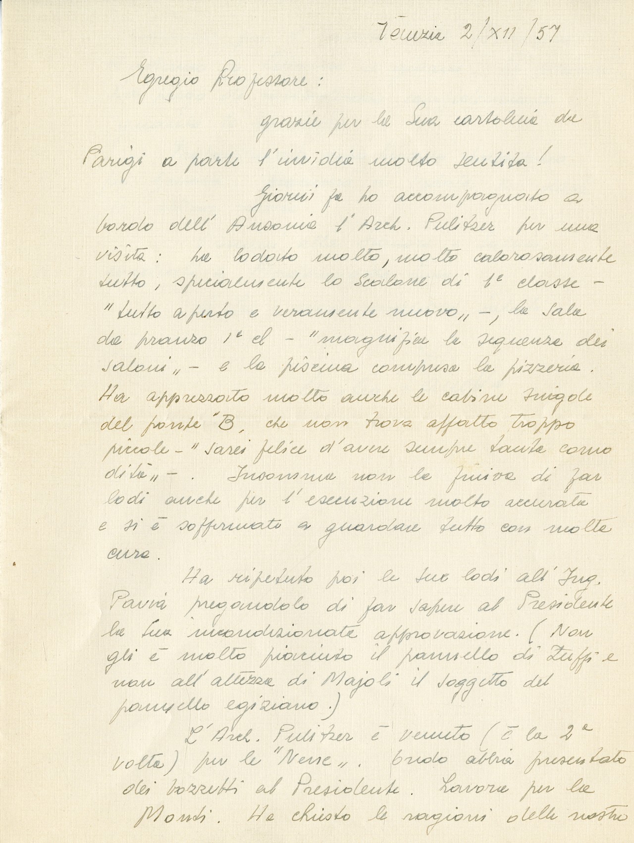 Tra i corrispondenti più ricorrenti figurano i pittori Luigi Spacal, Massimo Campigli (pseudonimo di Max Ihlenfeldt), Dino Predonzani e Federico Righi, gli scultori Marcello Mascherini, Ferruccio Quaia ed altri artisti, anche loro coinvolti nell’allestimento degli interni dei più celebri transatlantici e navi da crociera del periodo. Di alcune delle loro opere spesso sono presenti fotografie allegate alle lettere, oltre a schizzi e disegni appena abbozzati, alcuni dello stesso Zoncada, altri opera di terzi, tra i quali quelli attribuibili con certezza a Emanuele Luzzati con il quale l’architetto collaborò in più occasioni: la prima volta per la realizzazione degli interni dell'Andrea Doria per la quale Luzzati realizzò le decorazioni parietali per la sala dei bambini con immagini ispirate al mondo del circo, ed in seguito per l’Ausonia, per la Leonardo da Vinci e per la Oceanic. Sono inoltre presenti le specifiche tecniche degli ambienti progettati per le navi Oceanic, Stella Solaris, Michelangelo ed Eugenio C.