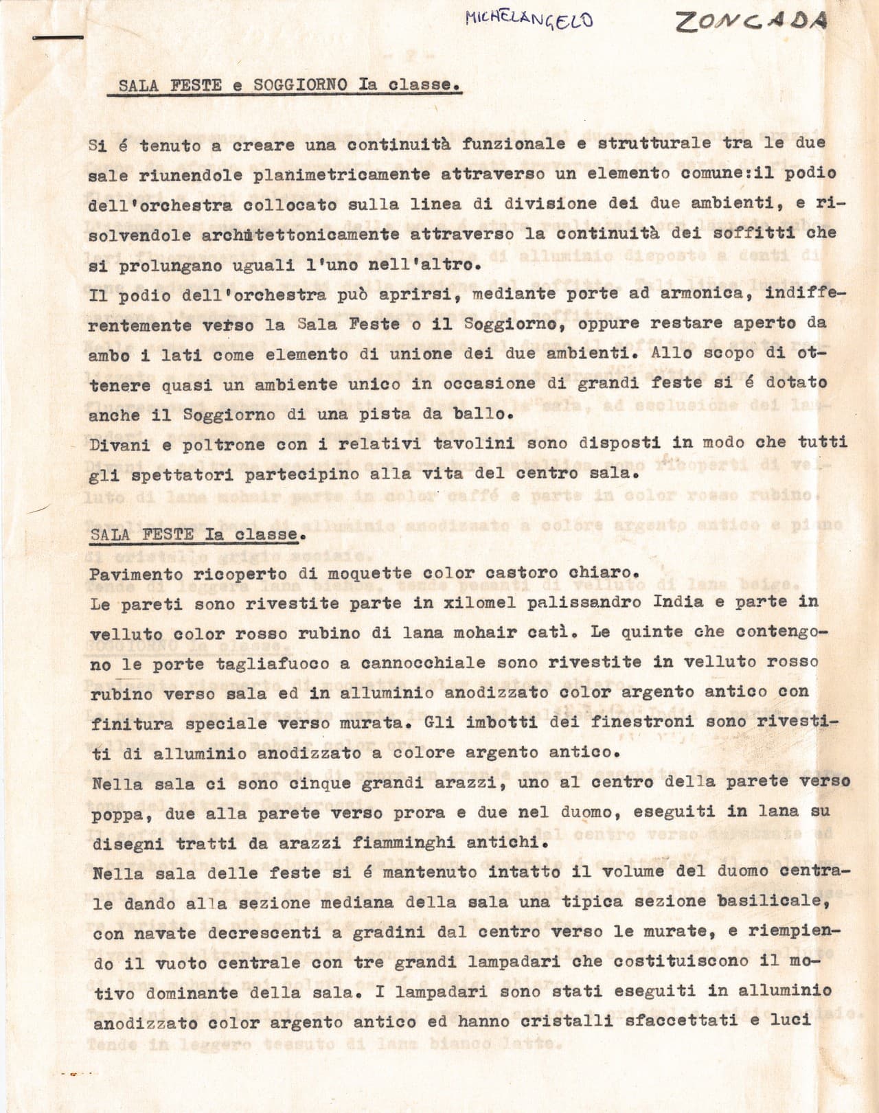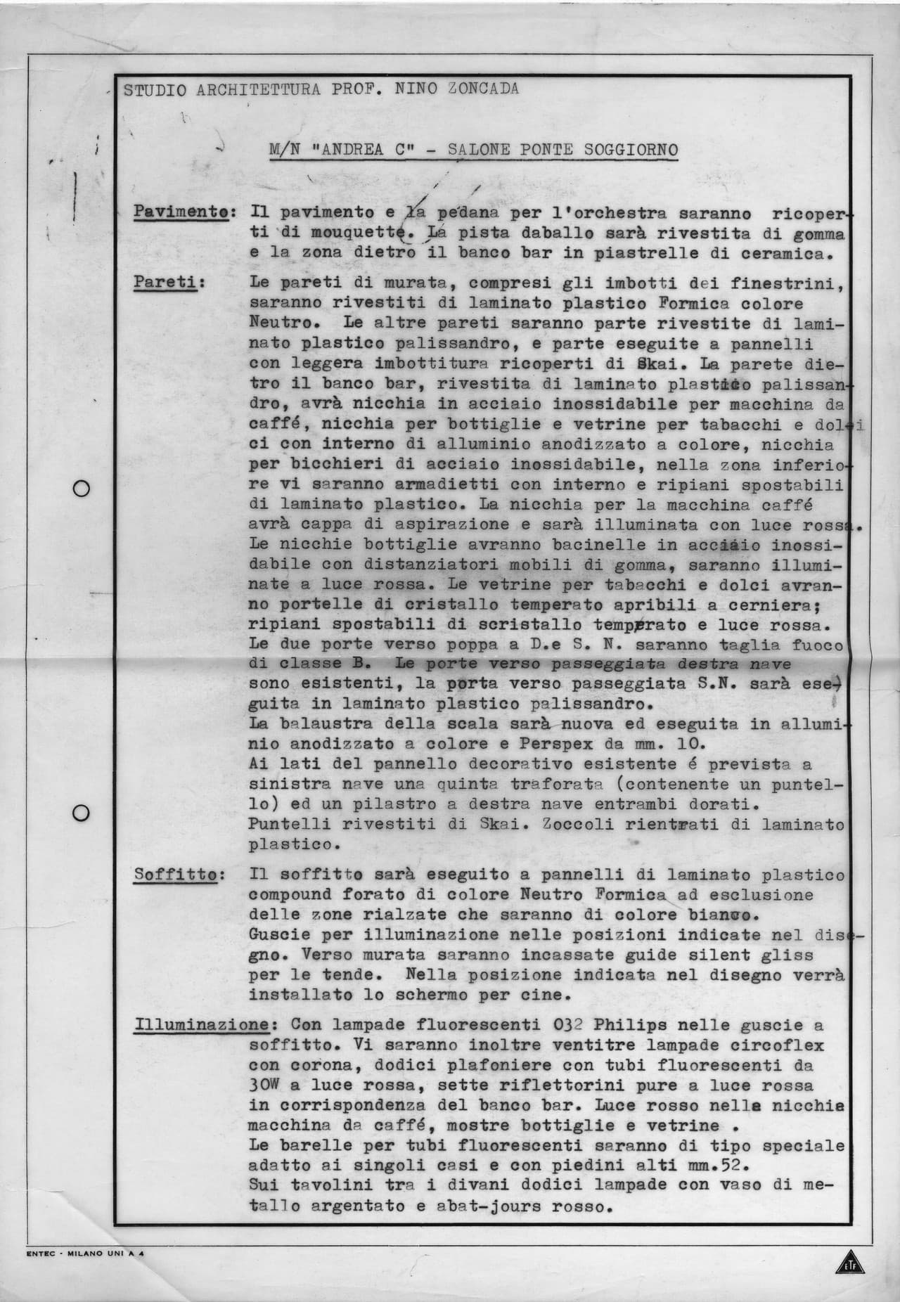 Specifiche tecniche e progetti di allestimento degli interni relativi ai lavori di arredo curati da Nino Zoncada per le unità Andrea C., Carla C., Eugenio C., Leonardo da Vinci, Michelangelo, Oceanic, Stella Oceanis e Stella Solaris.