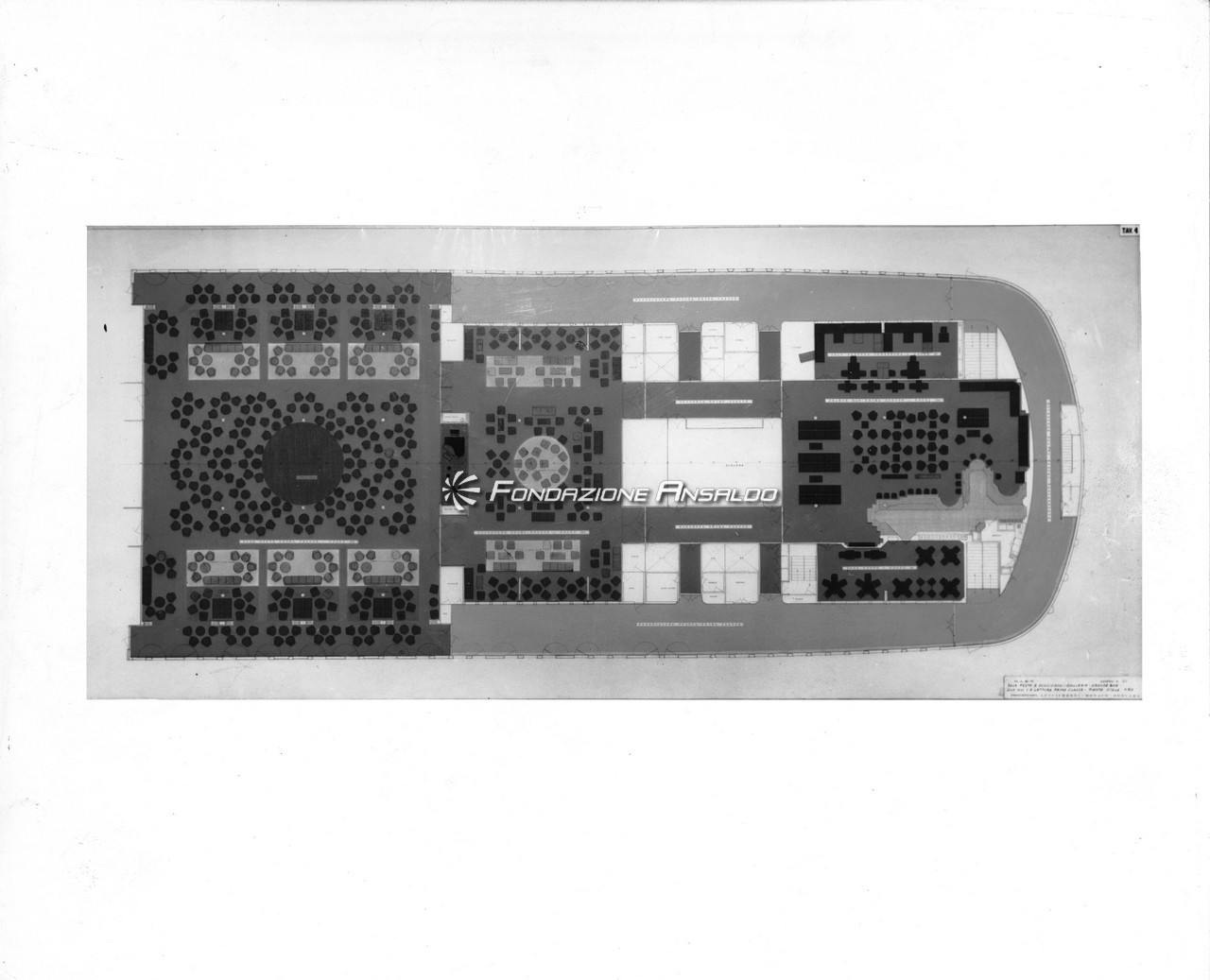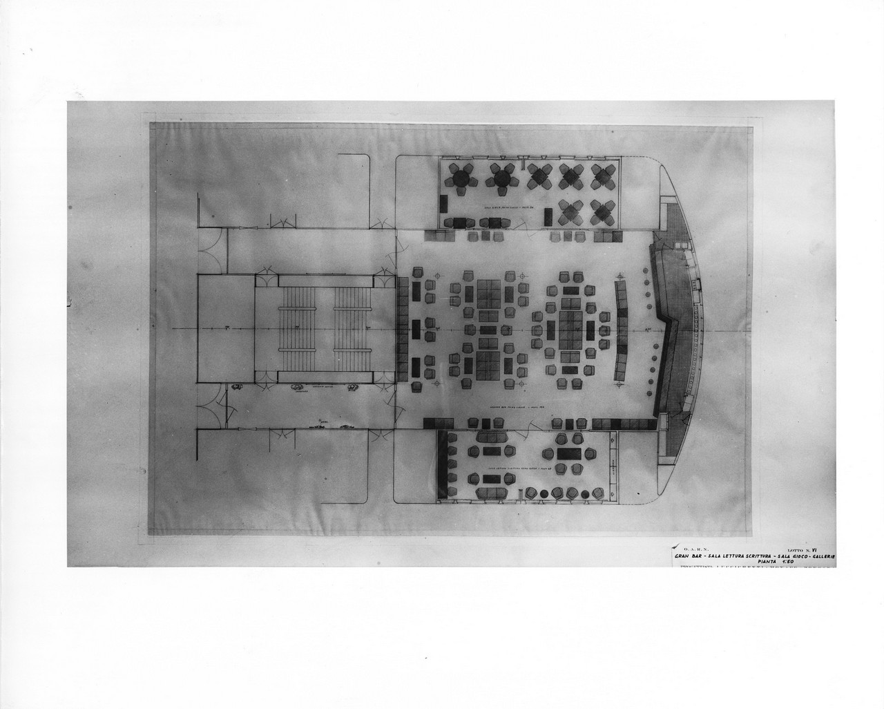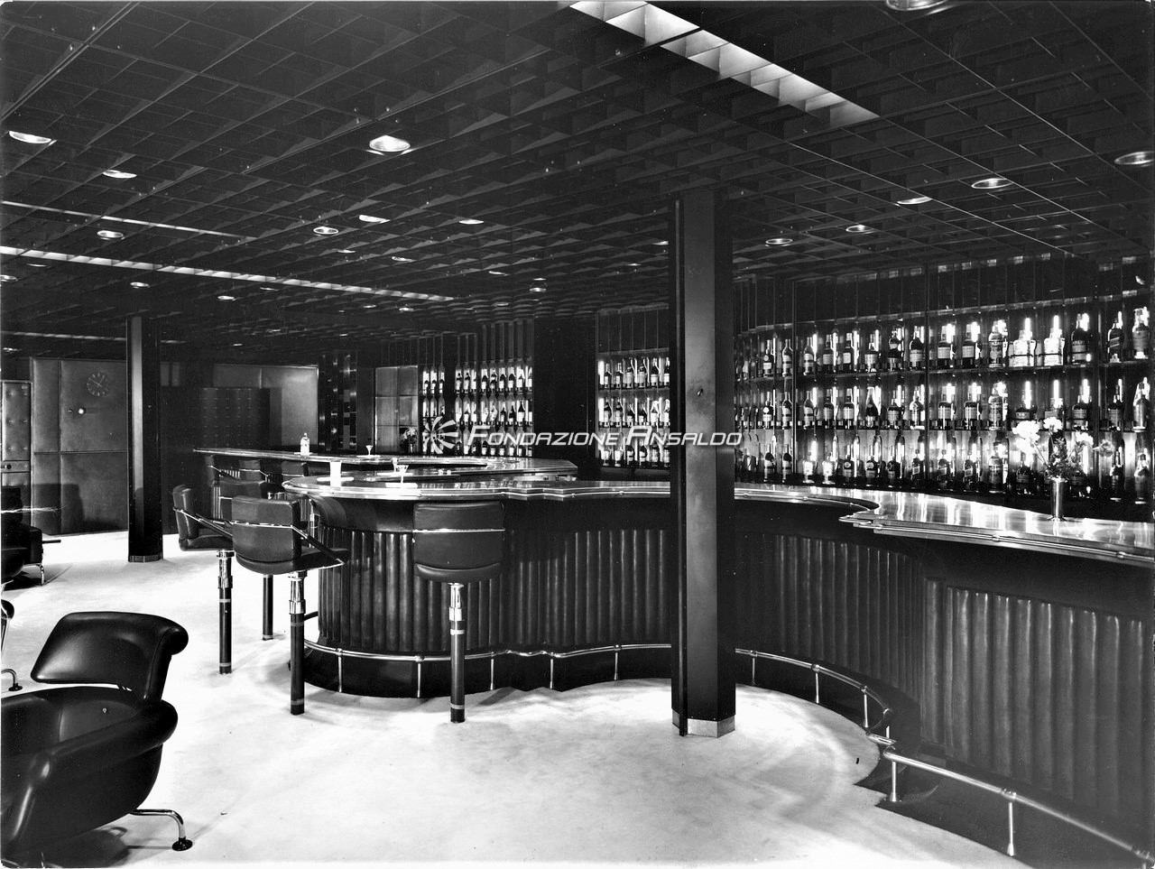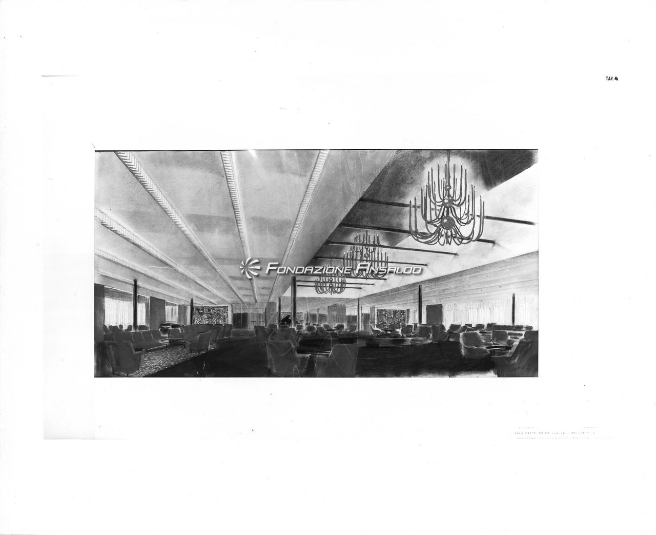 Nella sala di soggiorno era esposto sulla parete di prora un grande arazzo realizzato su disegno di Capogrossi dalla medesima arazzeria Scassa.