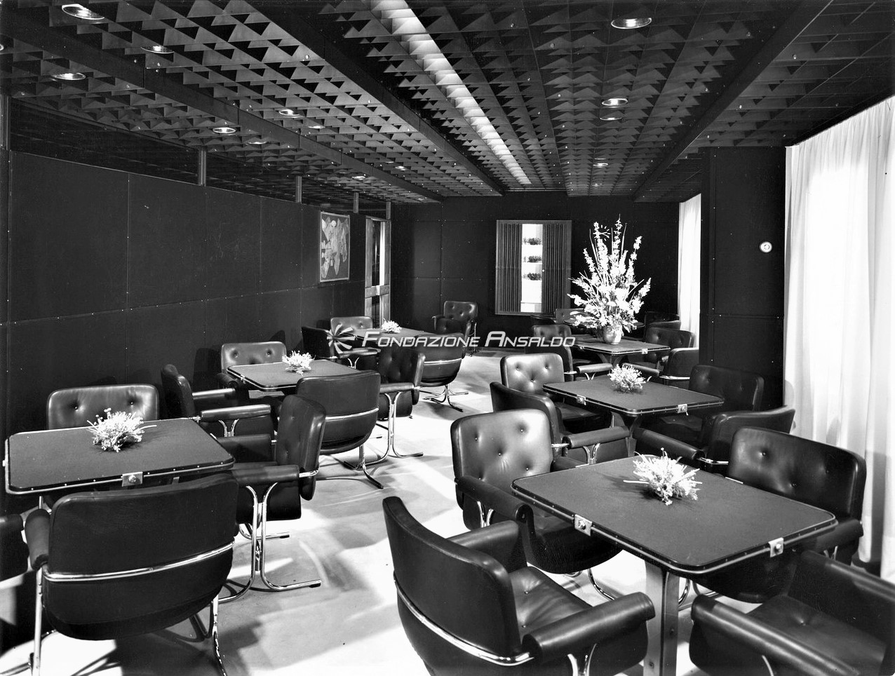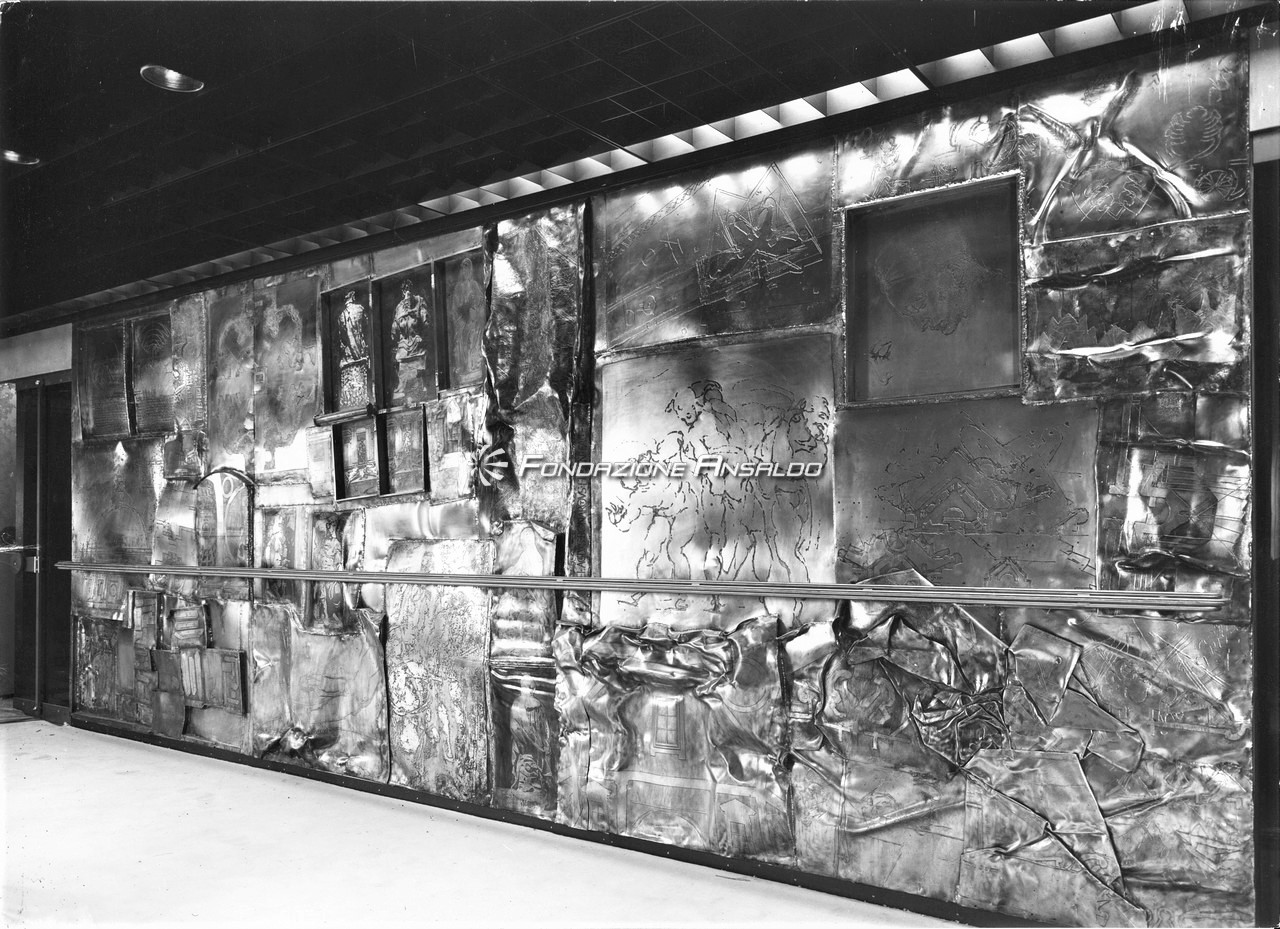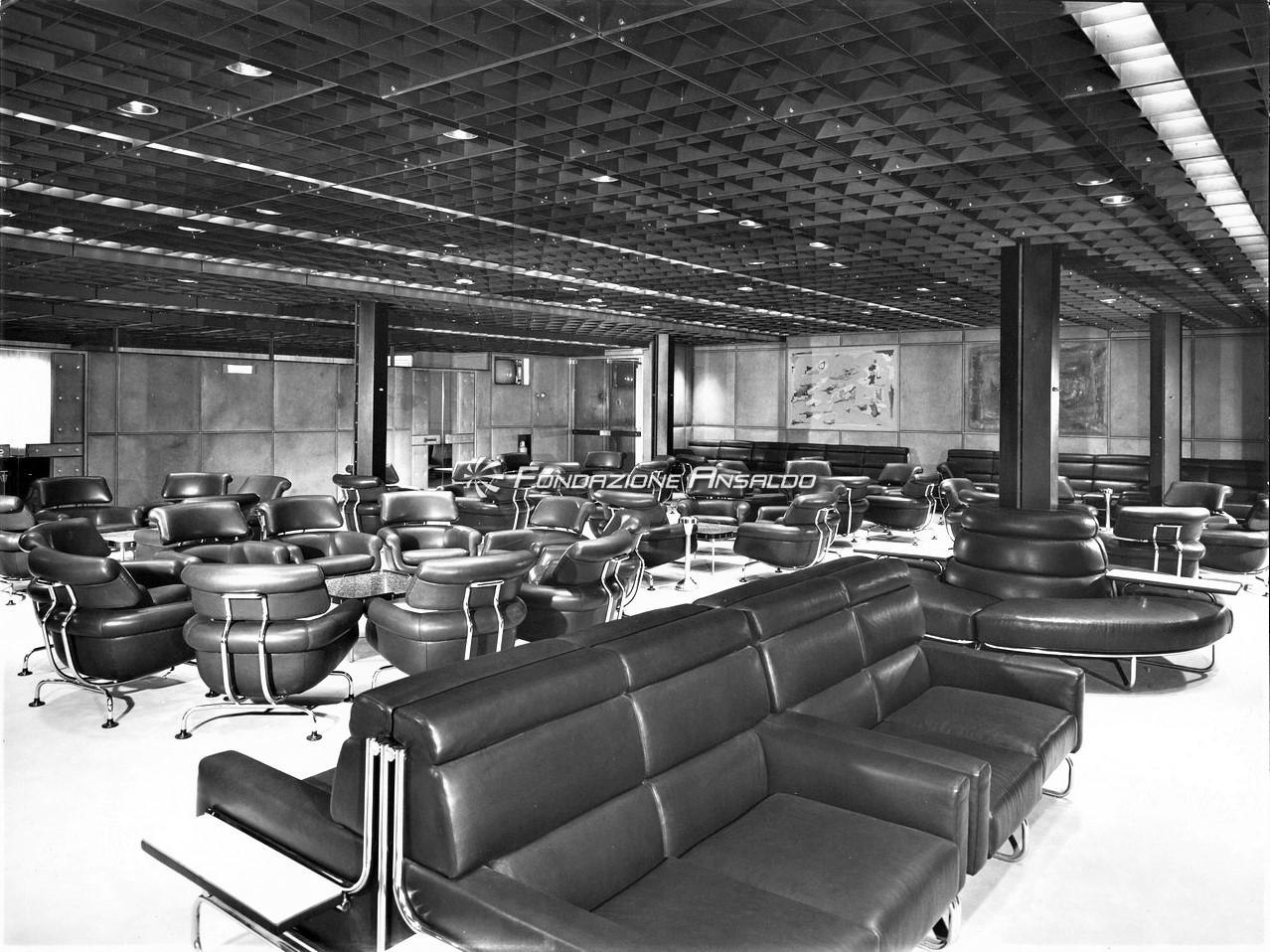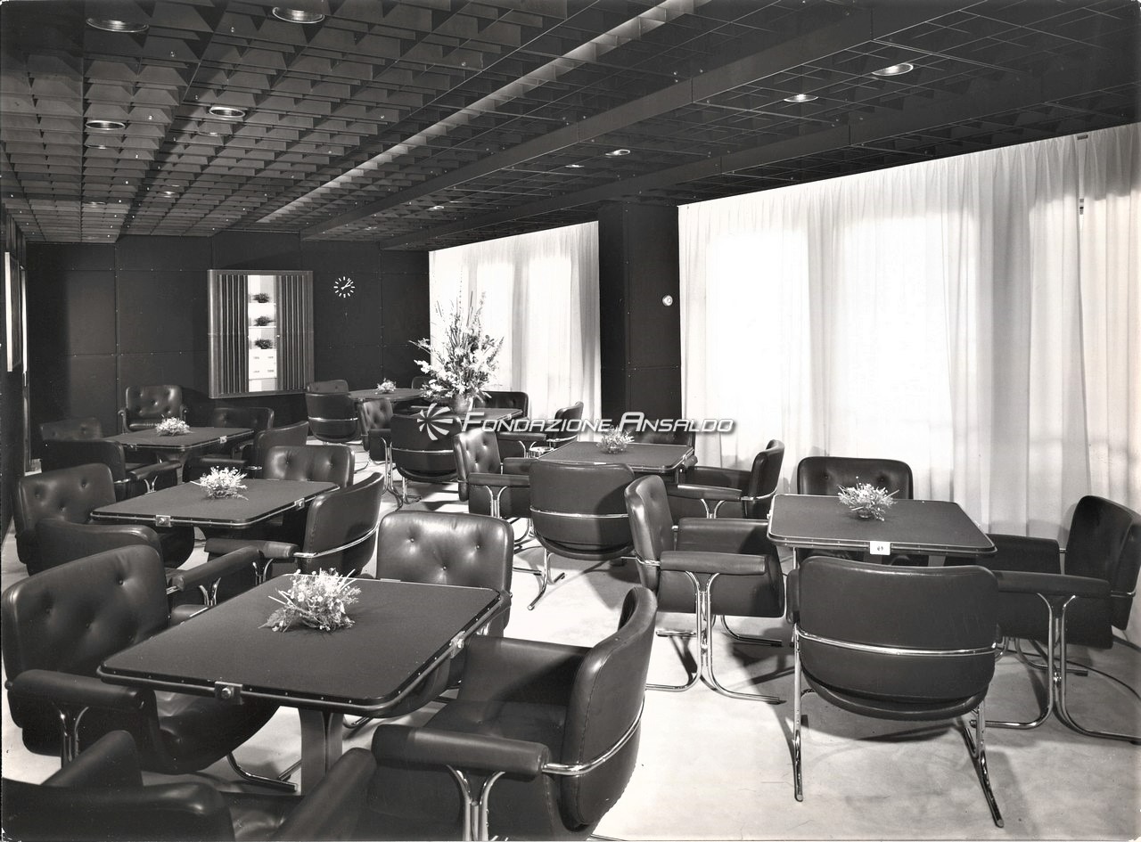 Le scelte architettoniche diedero un accento monumentale alla sala, smussato dall’estremo rigore delle line architettoniche, i lampadari erano in alluminio anodizzato argento antico, con cristalli sfaccettati e luci a incandescenza. Erano presenti cinque ampi arazzi che riproducevano gli antichi disegni fiamminghi degli arazzi feuille de choux, realizzati dall’impresa Scassa su cartoni di Tranquillo Marangoni. I divani e poltrone che arredano la sala erano in armatura metallica prodotti da Cassina e rivestiti di velluto di lana mohain di color caffè rosso rubino. L’illuminazione era assicurata da vetrate verso l’esterno che correvano per l’intera lunghezza della sala.