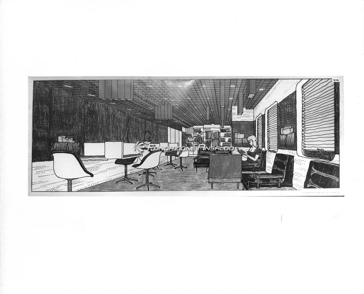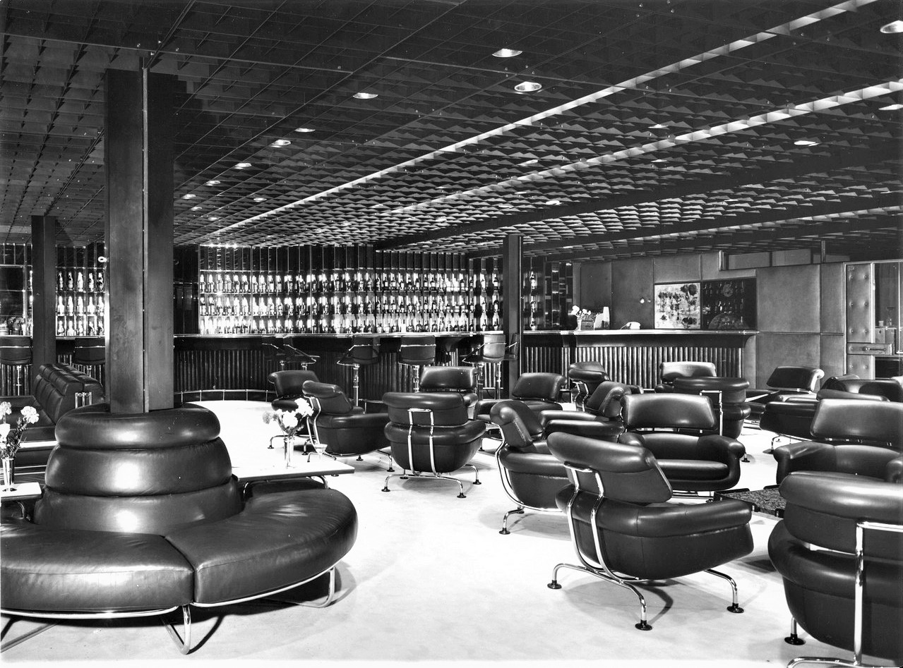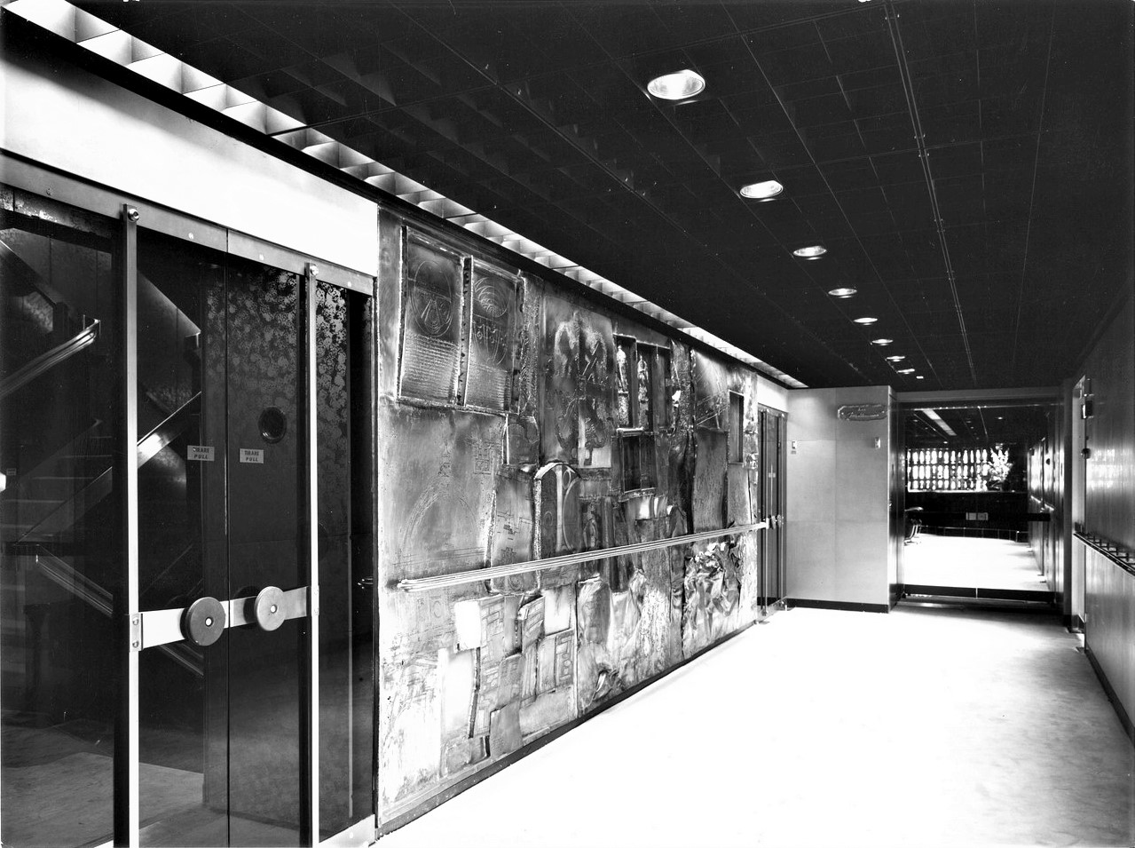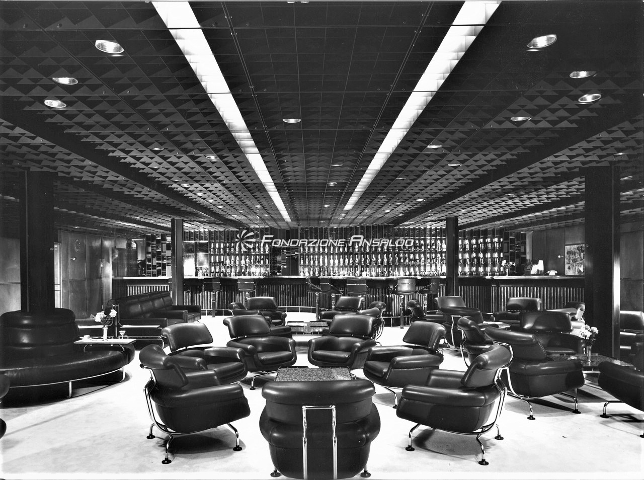 Le scelte architettoniche diedero un accento monumentale alla sala, smussato dall’estremo rigore delle line architettoniche, i lampadari erano in alluminio anodizzato argento antico, con cristalli sfaccettati e luci a incandescenza. Erano presenti cinque ampi arazzi che riproducevano gli antichi disegni fiamminghi degli arazzi feuille de choux, realizzati dall’impresa Scassa su cartoni di Tranquillo Marangoni. I divani e poltrone che arredano la sala erano in armatura metallica prodotti da Cassina e rivestiti di velluto di lana mohain di color caffè rosso rubino. L’illuminazione era assicurata da vetrate verso l’esterno che correvano per l’intera lunghezza della sala.