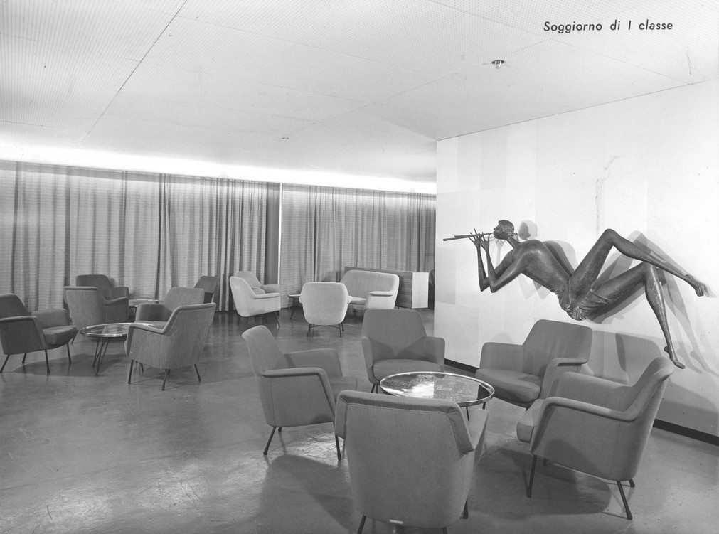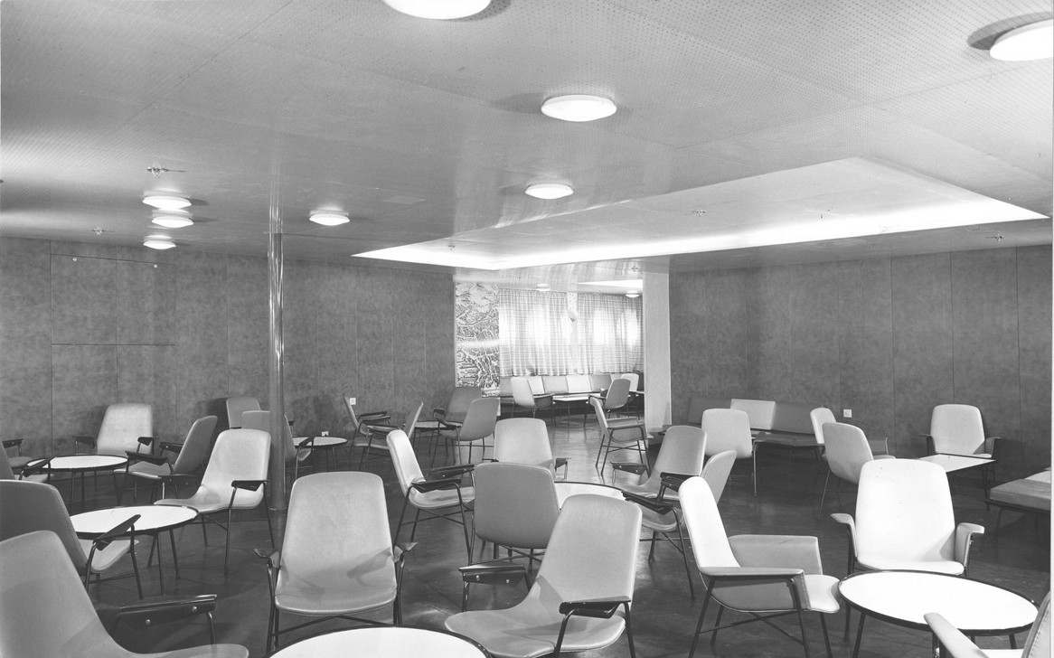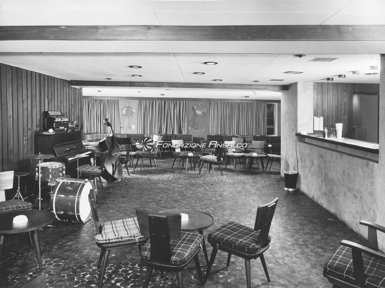La progettazione evita il decorativismo anche negli elementi minori e si affida alla ripetitività dei soffitti in pannelli forati e alla continuità dei pavimenti in gomma.