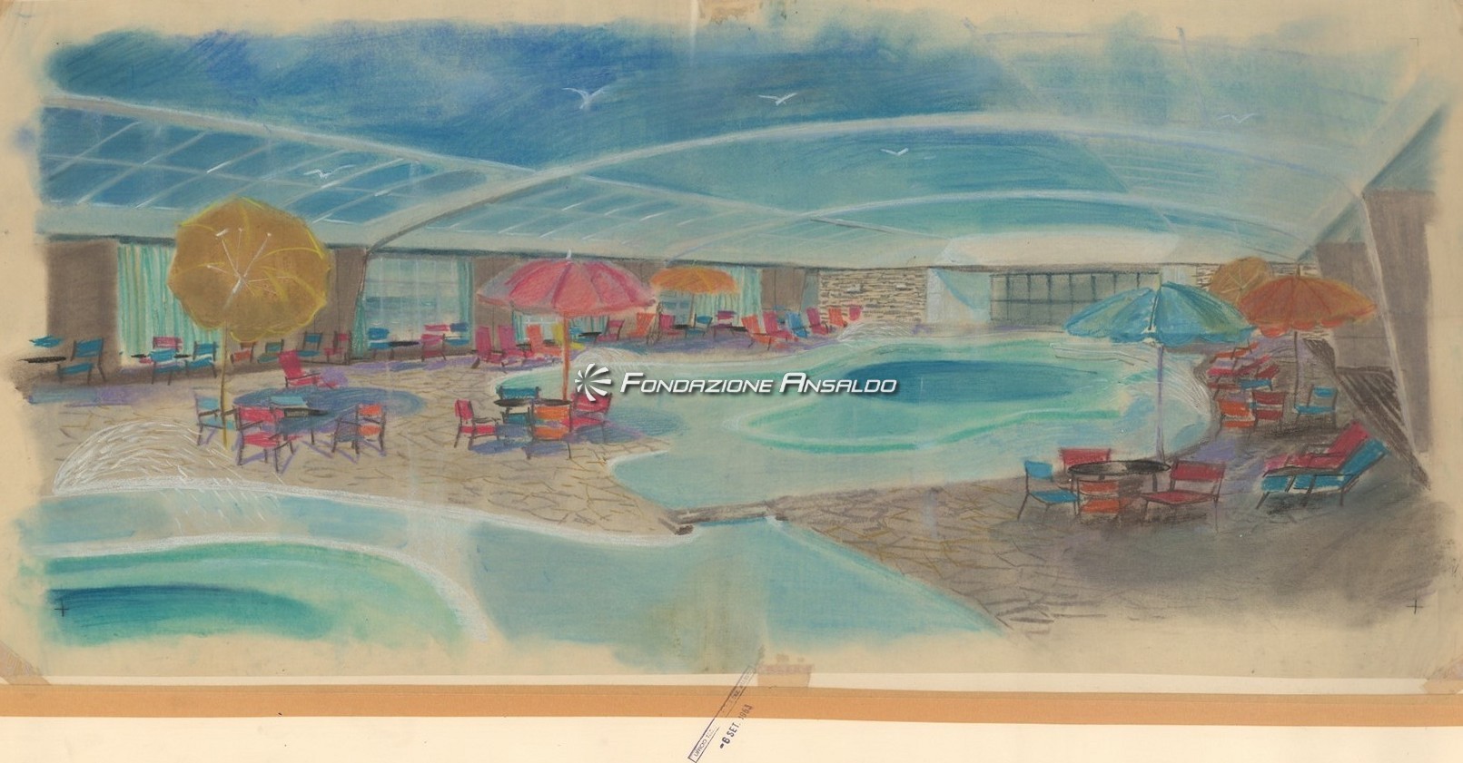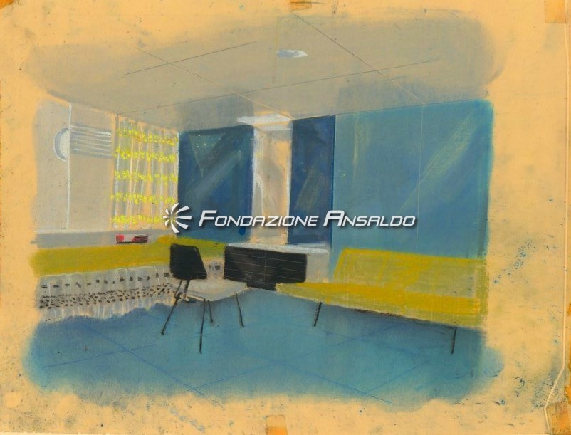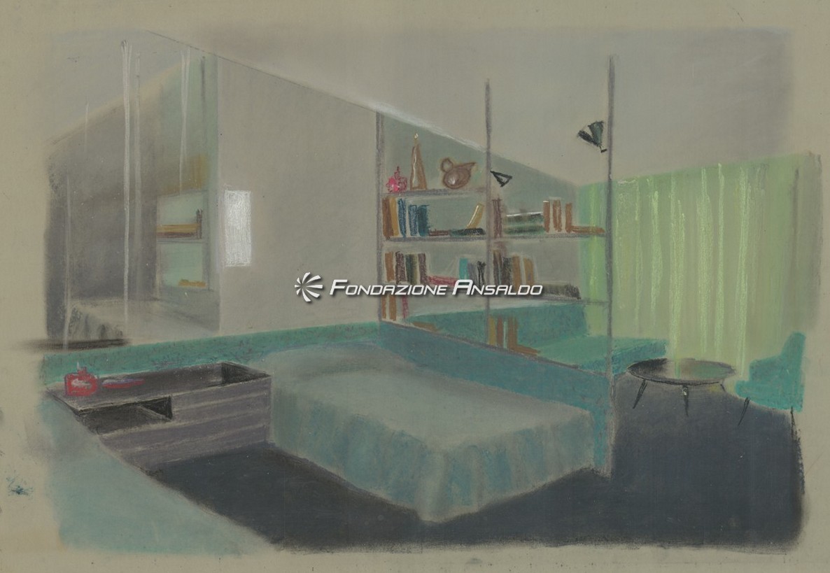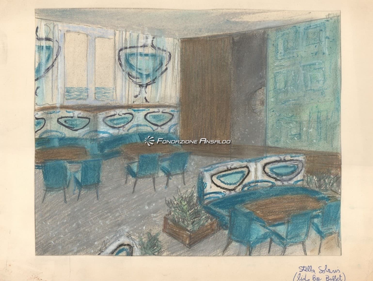 Traghetto Navalmeccanica - Rappresentazione su carta da lucido del soggiorno bar e ufficio turistico