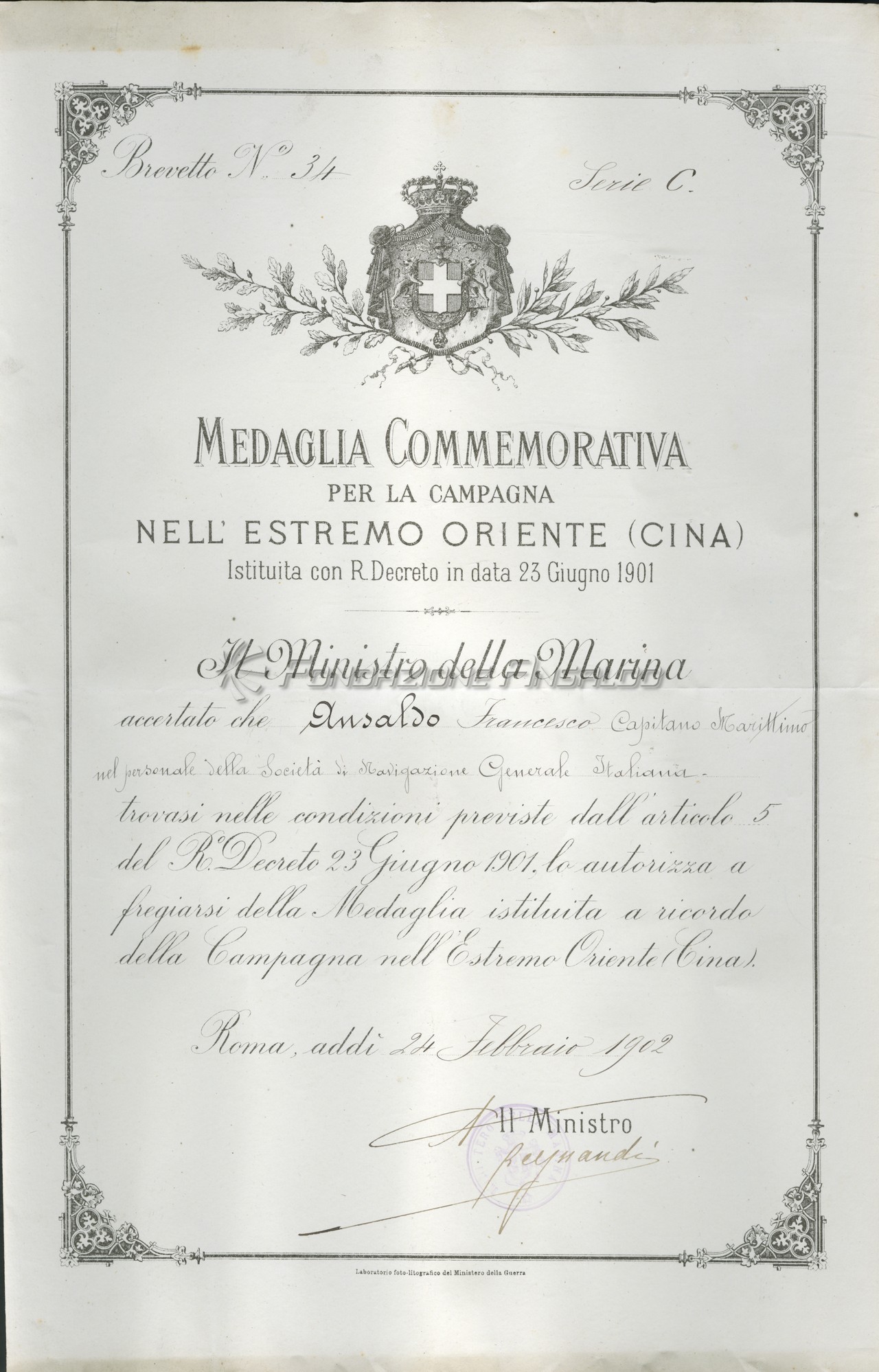 Attestato di benemerenza dell'asilo per gli orfani della Gente di Mare