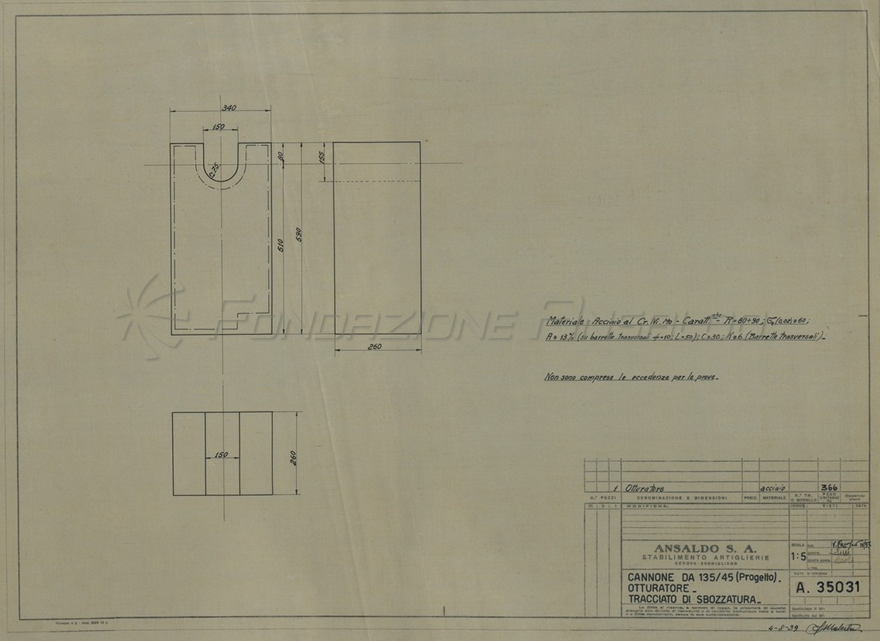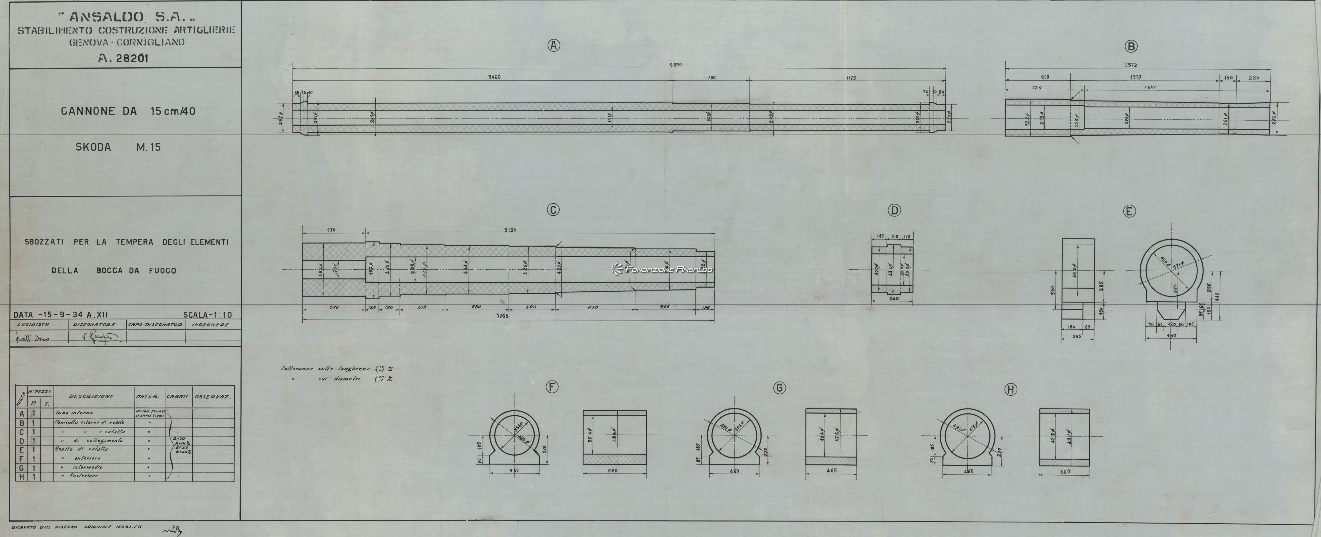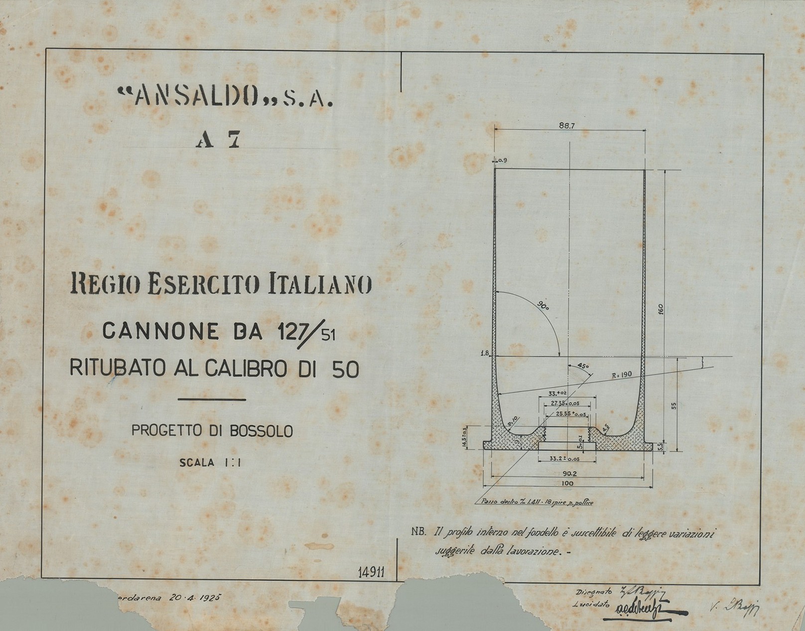 Cannone da 152/45 S. 1911 - tracciato di sbozzatura della camicia