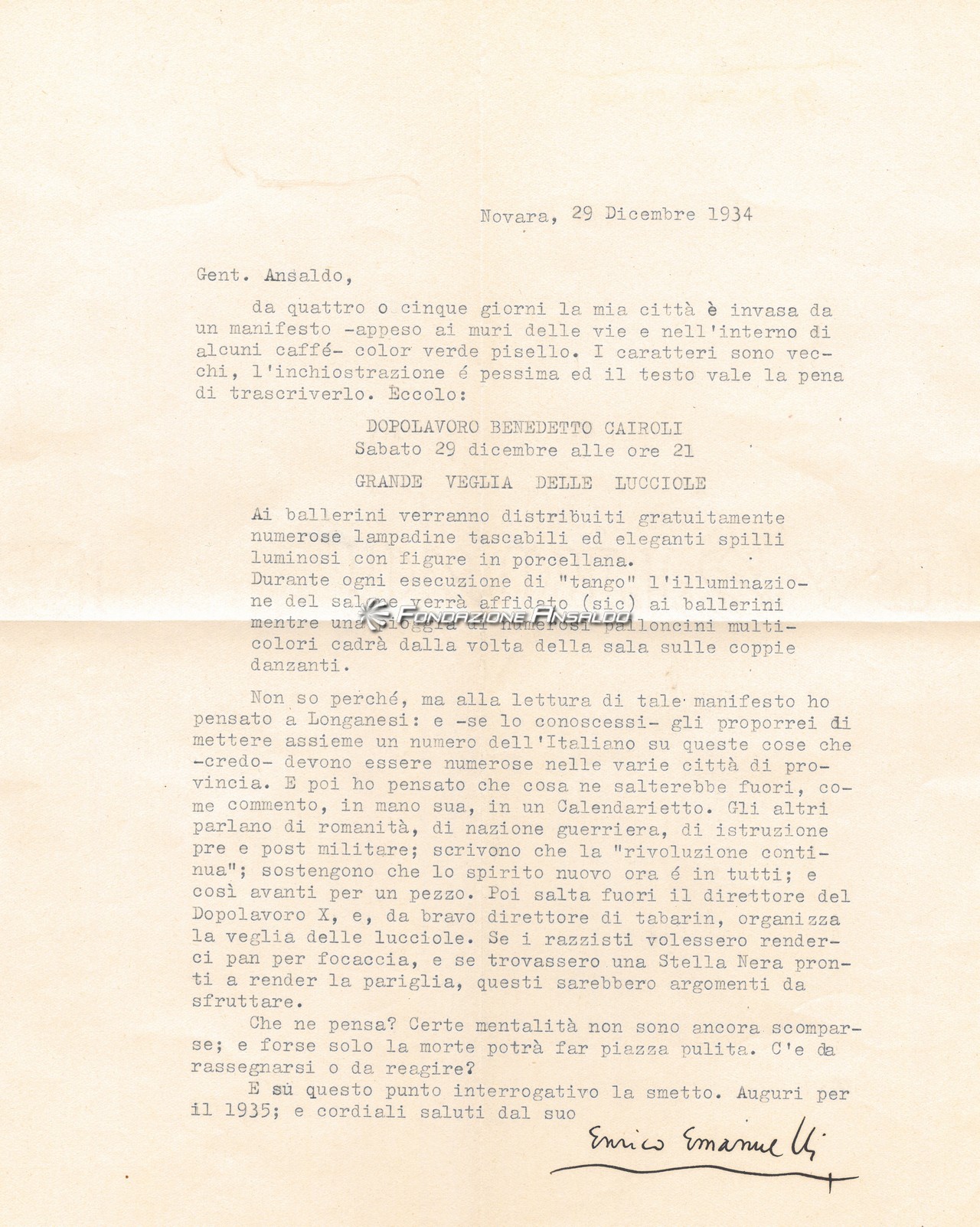 Lettera di Enrico Emanuelli a Giovanni Ansaldo, 29-12-1934